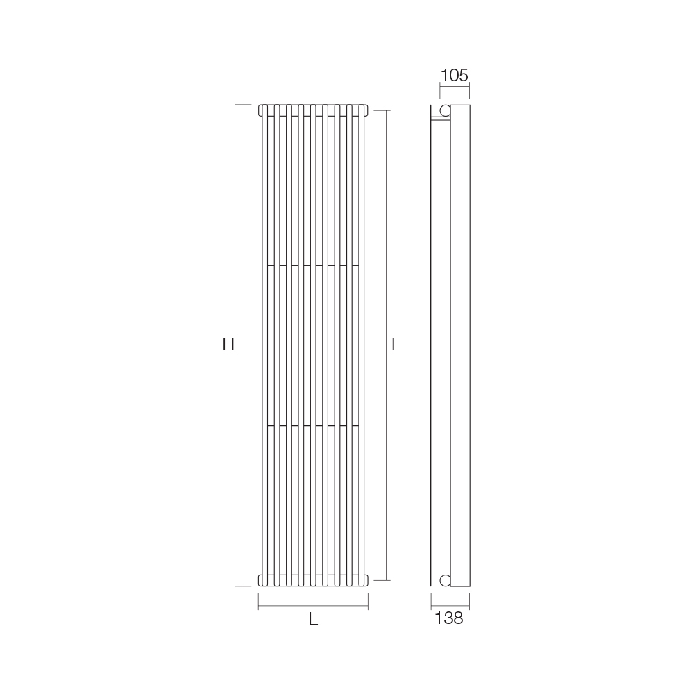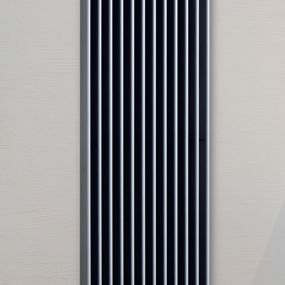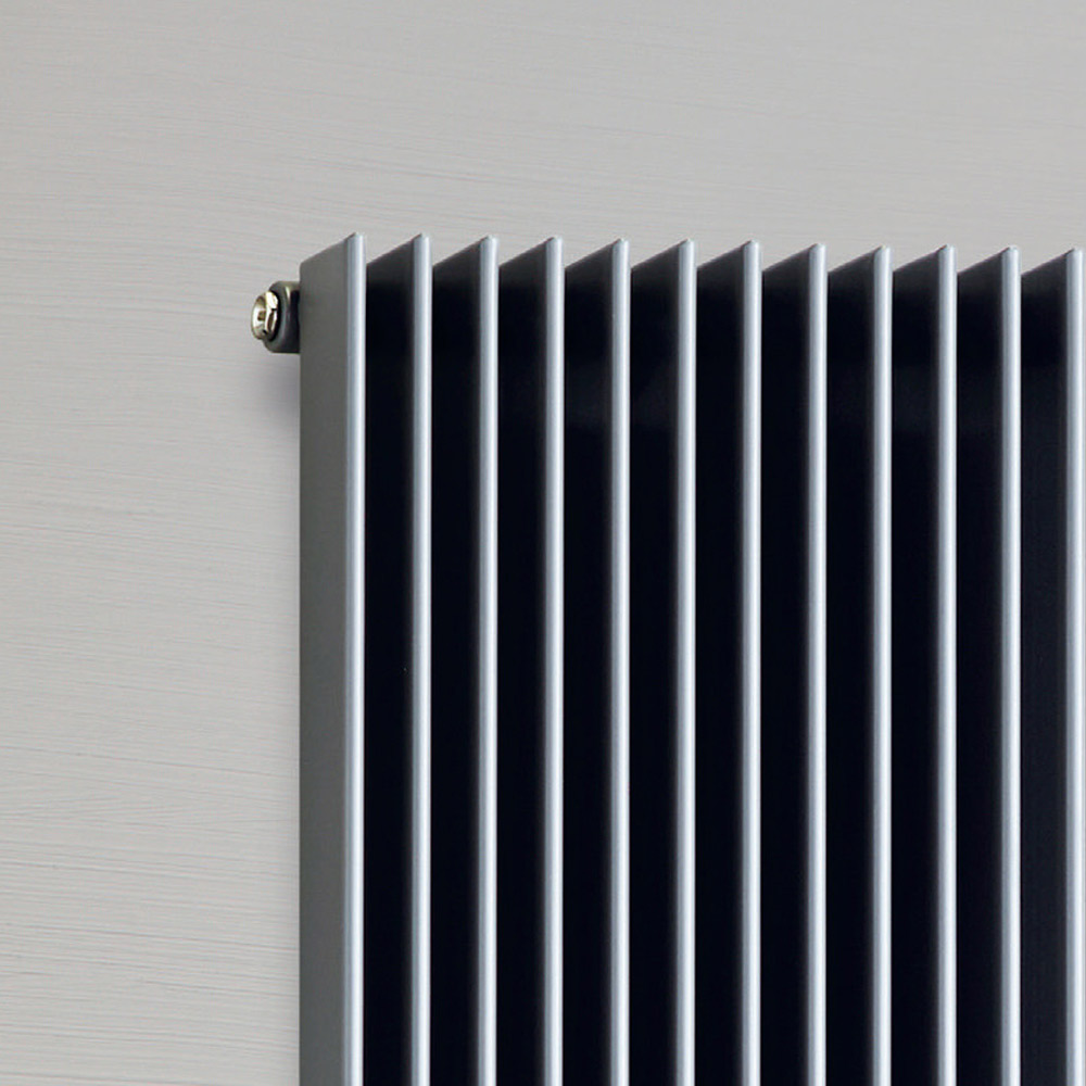 Hydraulic radiator in carbon steel with GAGS finish consisting of a series of flat elements measuring 7x1.1 cm welded onto horizontal manifolds with a diameter of 3.5 cm. Entirely made in Italy with wall fixing kit, vent valve and blind cap included .