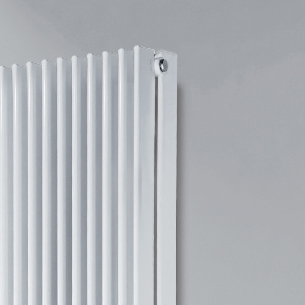Hydraulic radiator in carbon steel with traffic white finish consisting of a double series of flat elements measuring 7x1.1 cm welded onto horizontal manifolds with a diameter of 3.5 cm entirely made in Italy with wall fixing kit, vent valve and blind plug included .