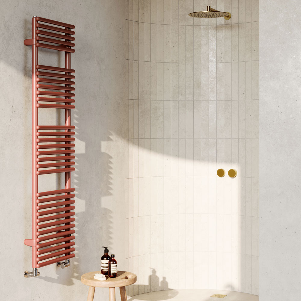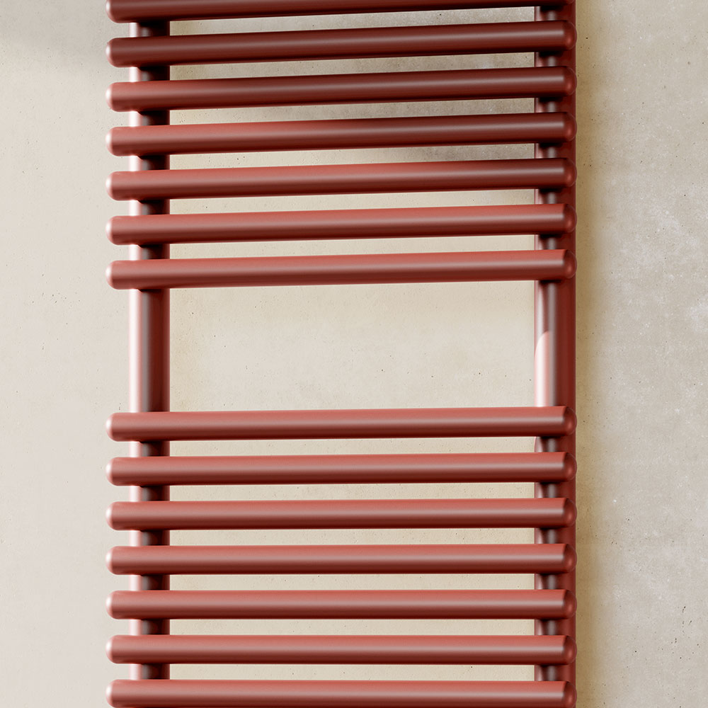 Brighten up your bathroom with this rust towel warmer , a true symbol of design and practicality . Its vertical queues and colour are designed not only to warm your towels, but also to add a hint of bold style to any room.
