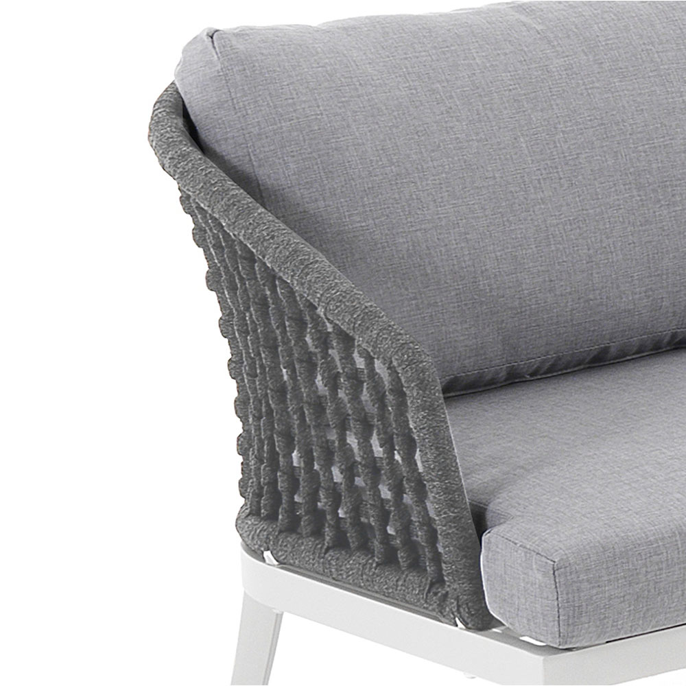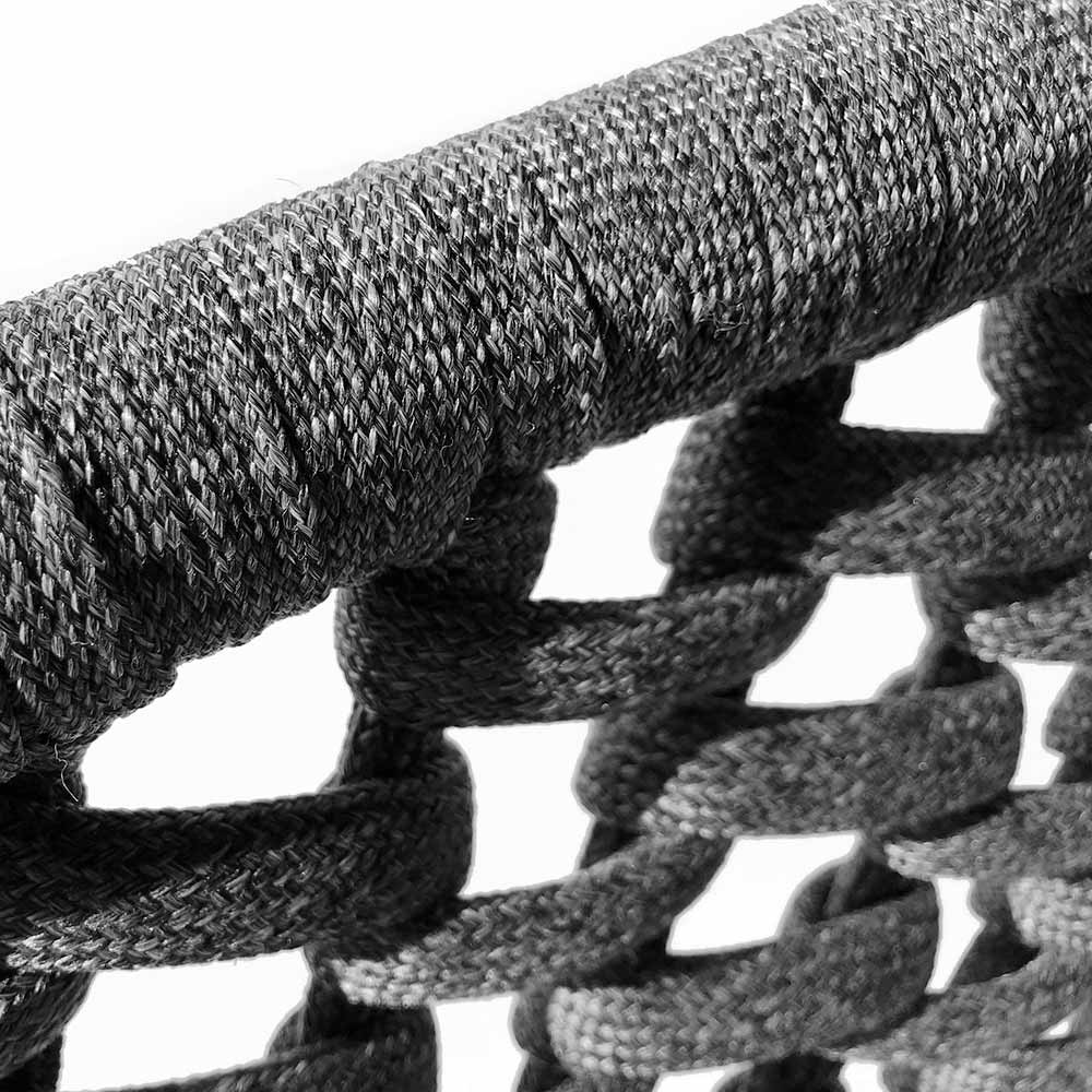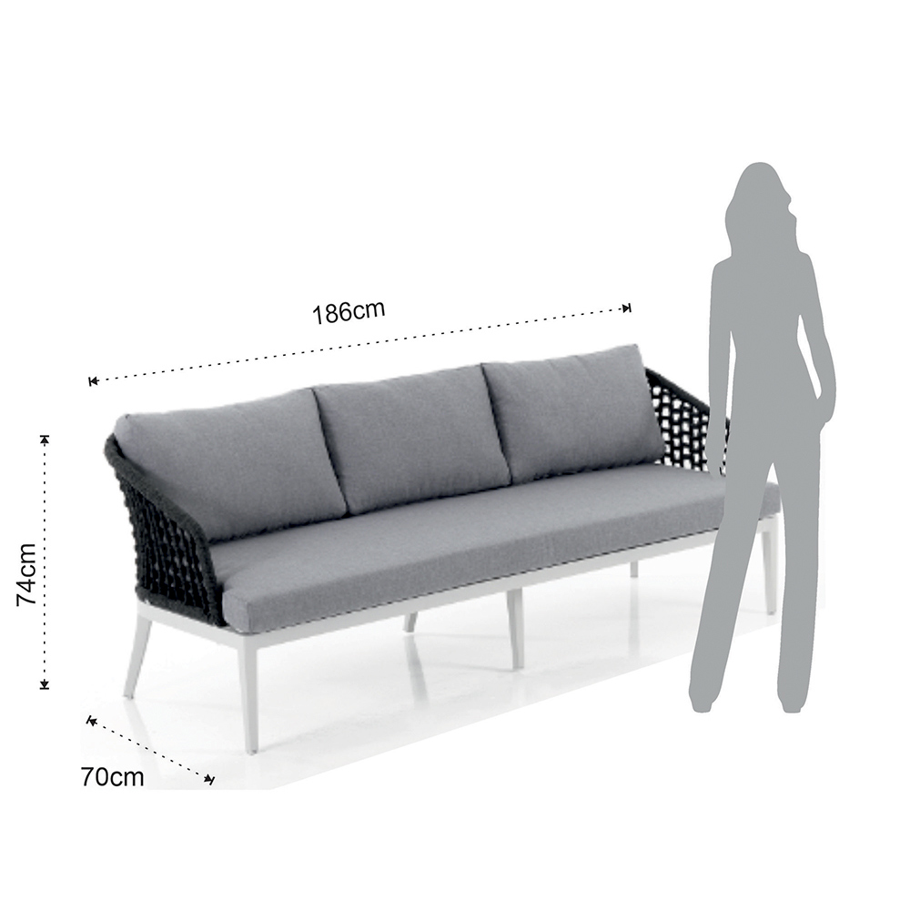 The light grey cushions offer cosy comfort and a pleasant contrast with the dark structure, inviting relaxation and conversation. The matching coffee table is ideal for hosting evening cocktails or alfresco breakfasts, serving as a central point for entertaining and relaxation.
