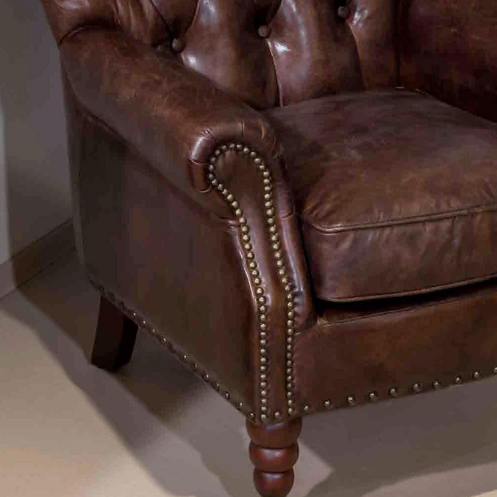 This armchair is part of a collection that canò boast abeauty and timeless taste that resists the passing of fashions and suggestions of trends. Sturdy and sturdy structures, capitonnée workmanship, hand punching and nailing, real leather (leather flower) upholstery, worked with a special tanning specially designed to give the leather a vintage, aged look. The products in this collection are distinguished by the refined importance of the shapes and theprecious materials that animate them. They are seats that prove to be perfect for embellishing high-end furnishing environments that make elegance and character their prerogative.