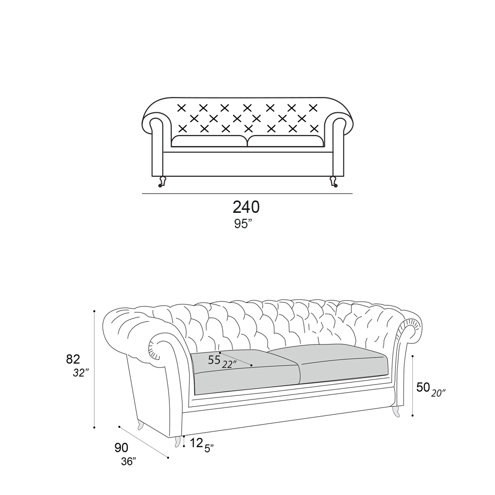 gold painted metal wheels. The sofa evokes a classic essence with a contemporary twist. Its solid structure is paired with comfortable cushions and elegant upholstery, available in different shades. The design features clean queues and a low silhouette, with slim caster feet that add modernity. Ideal for refined spaces, it offers inviting comfort without compromising style, making it a sophisticated option for residential environments and contract spaces such as offices, hotels or exclusive club lounges.