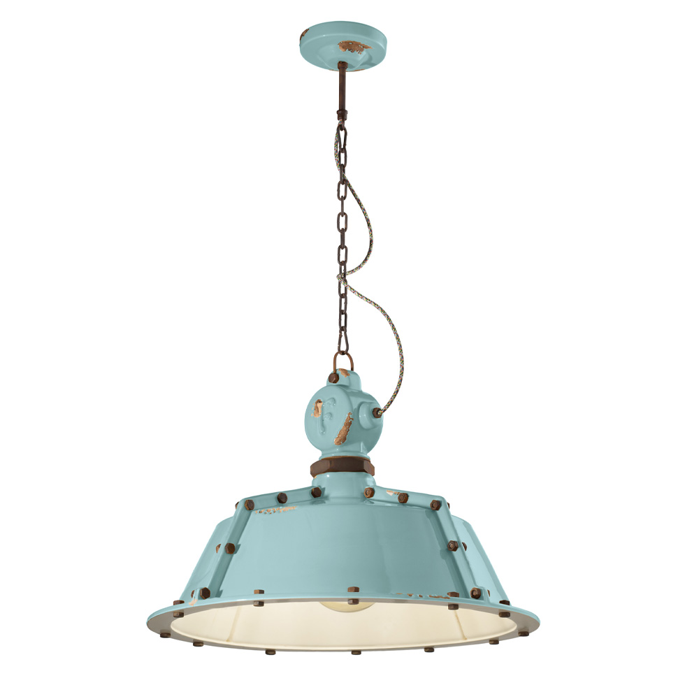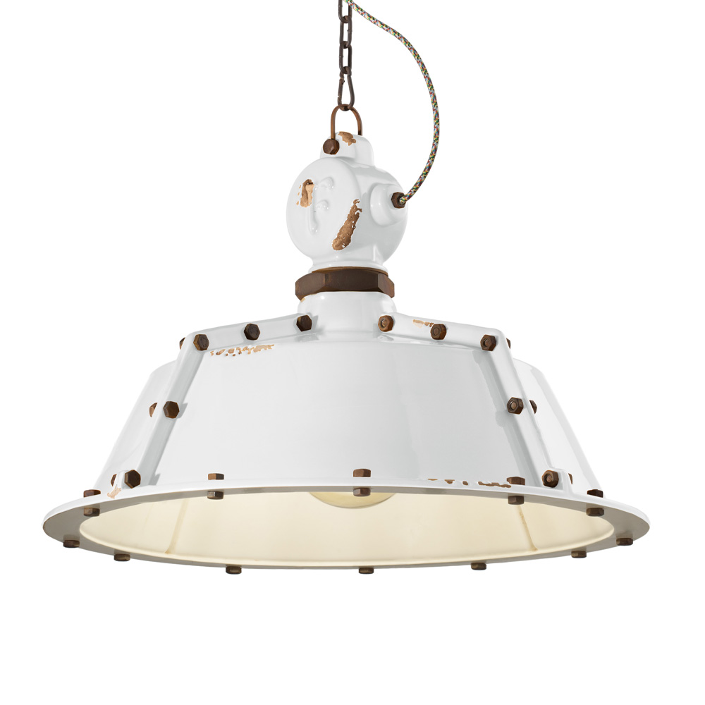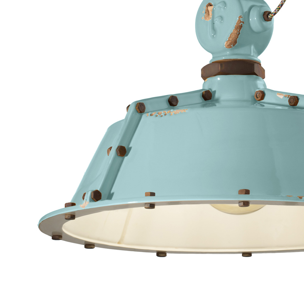 Handcrafted suspended lamp in ceramic and iron, industrial design made in Italy by Ferroluce.