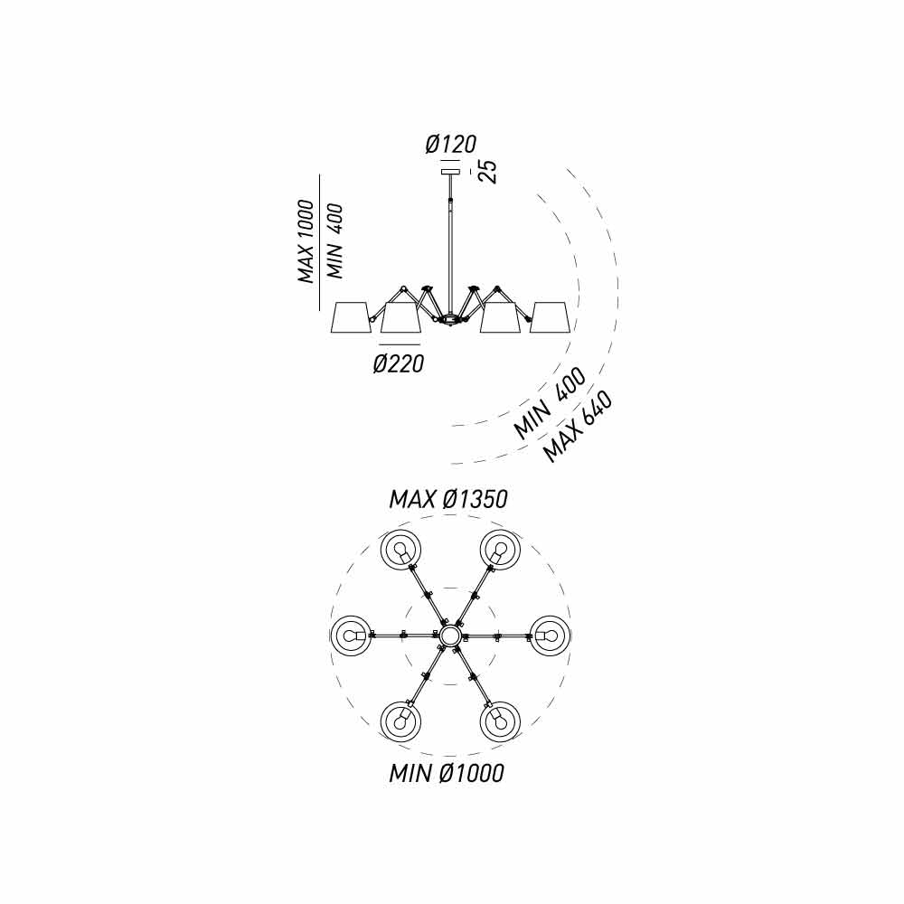 Measures Diffuser: Ø220 mm; max suspension h. 1000mm; max overall dimensions 1350mm; Rosette Ø120 mm