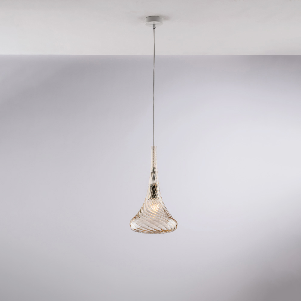 Available in Transparent , Amber , or Grey finishes, this pendant light easily adapts to a variety of furnishing contexts: bright and minimalist in the transparent version, warm and enveloping in amber, understated and elegant in grey. It is ideal for kitchens , islands , dining tables , hallways , reading corners , and designer contract spaces , whether used individually or in compositions.