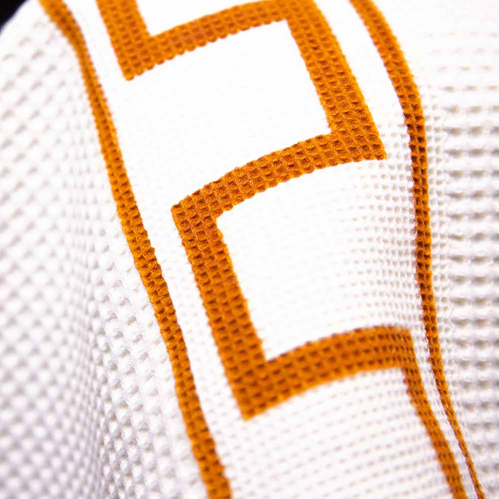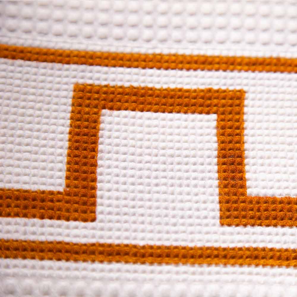 Bath towel in pure white honeycomb cotton with rust-colored Pompeian Greek print handmade, unique piece, made in Italy.