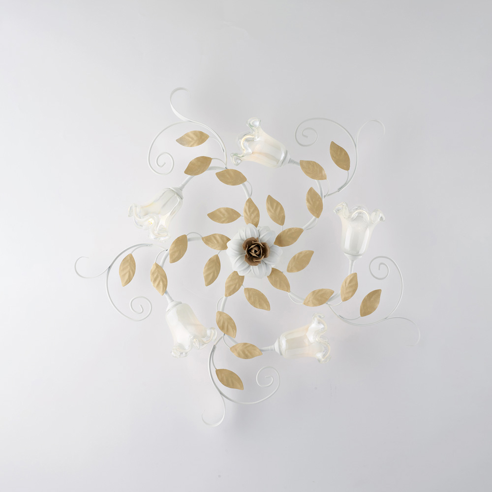 Refined and decorative, this classic handcrafted ceiling light in ivory-lacquered iron is a luminous creation with a strong romantic character. The floral structure, embellished with sinuous curls, decorative leaves, and flower-shaped glass diffusers , lends the ceiling a light and harmonious elegance, transforming the light into a true decorative element.