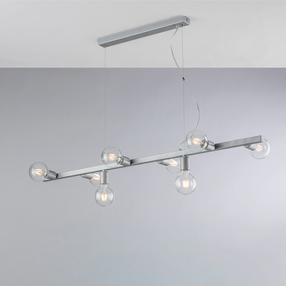 Streamlined, modern, and elegant, this handcrafted iron pendant lamp is a lighting solution designed for contemporary and refined spaces. The simple, well-balanced horizontal structure houses spherical glass diffusers that provide a diffused, even, and dramatic light.