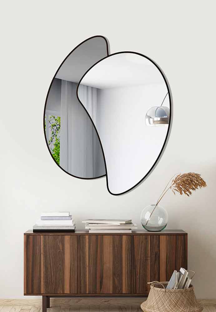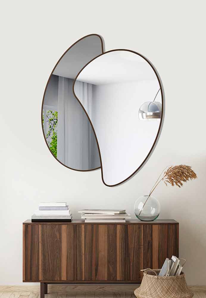 wall mirror is made up of two mirrors, one of which is a smoky colour, with elegant queues and modern shapes combined with refined lacquered finishes for a result with a minimal and decorative aesthetic impact, in a unique style.