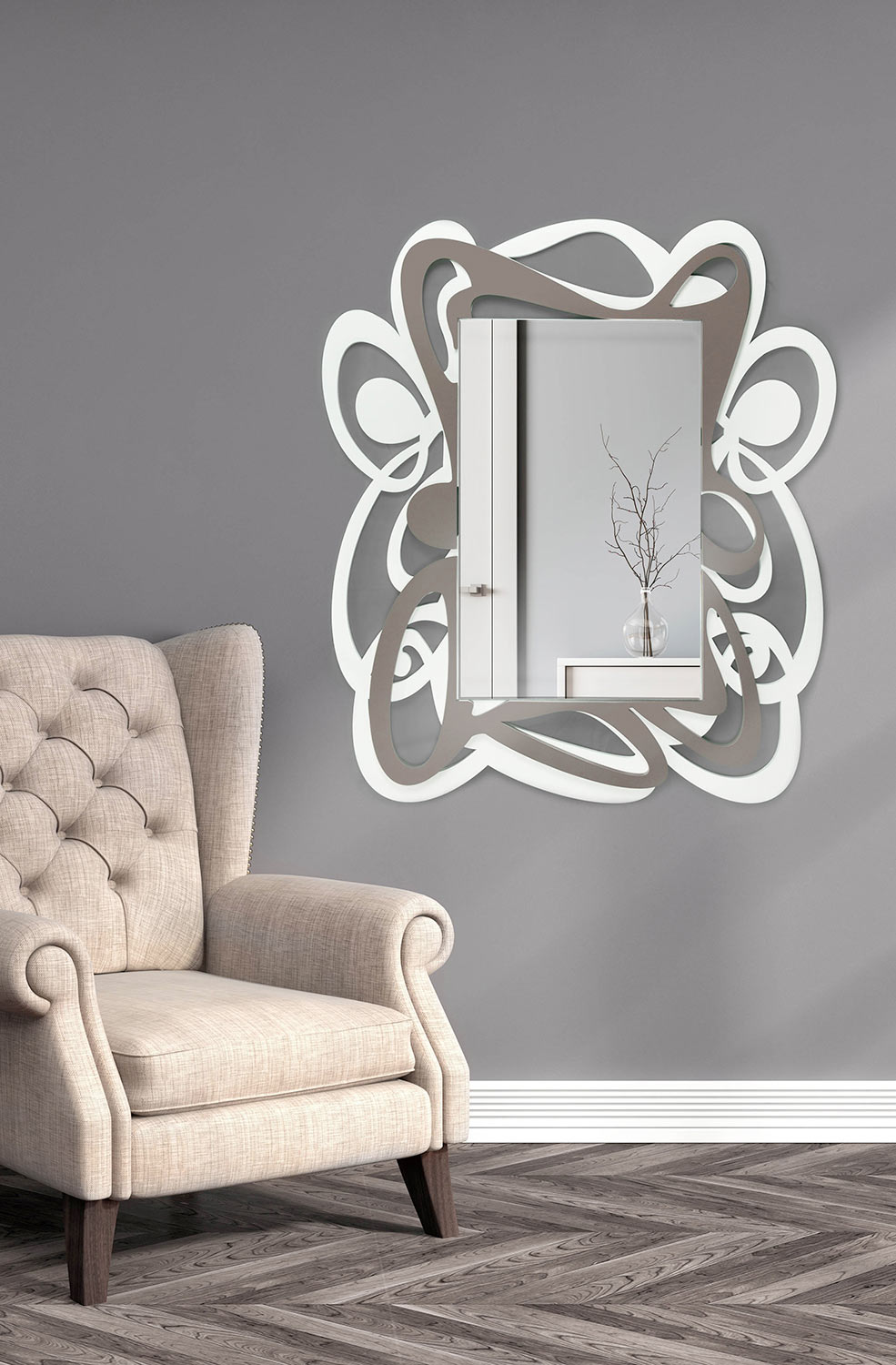 Large Modern Design Decorative Wall Mirror in White and Cocoa - Bocchio