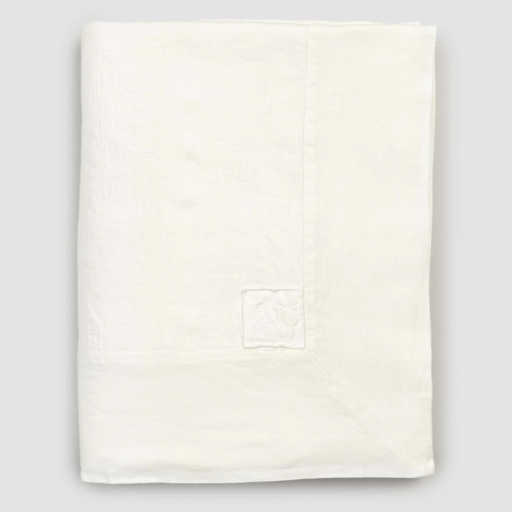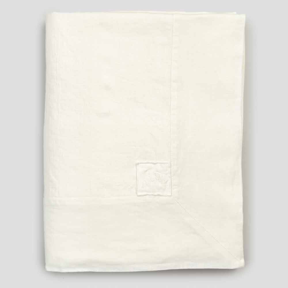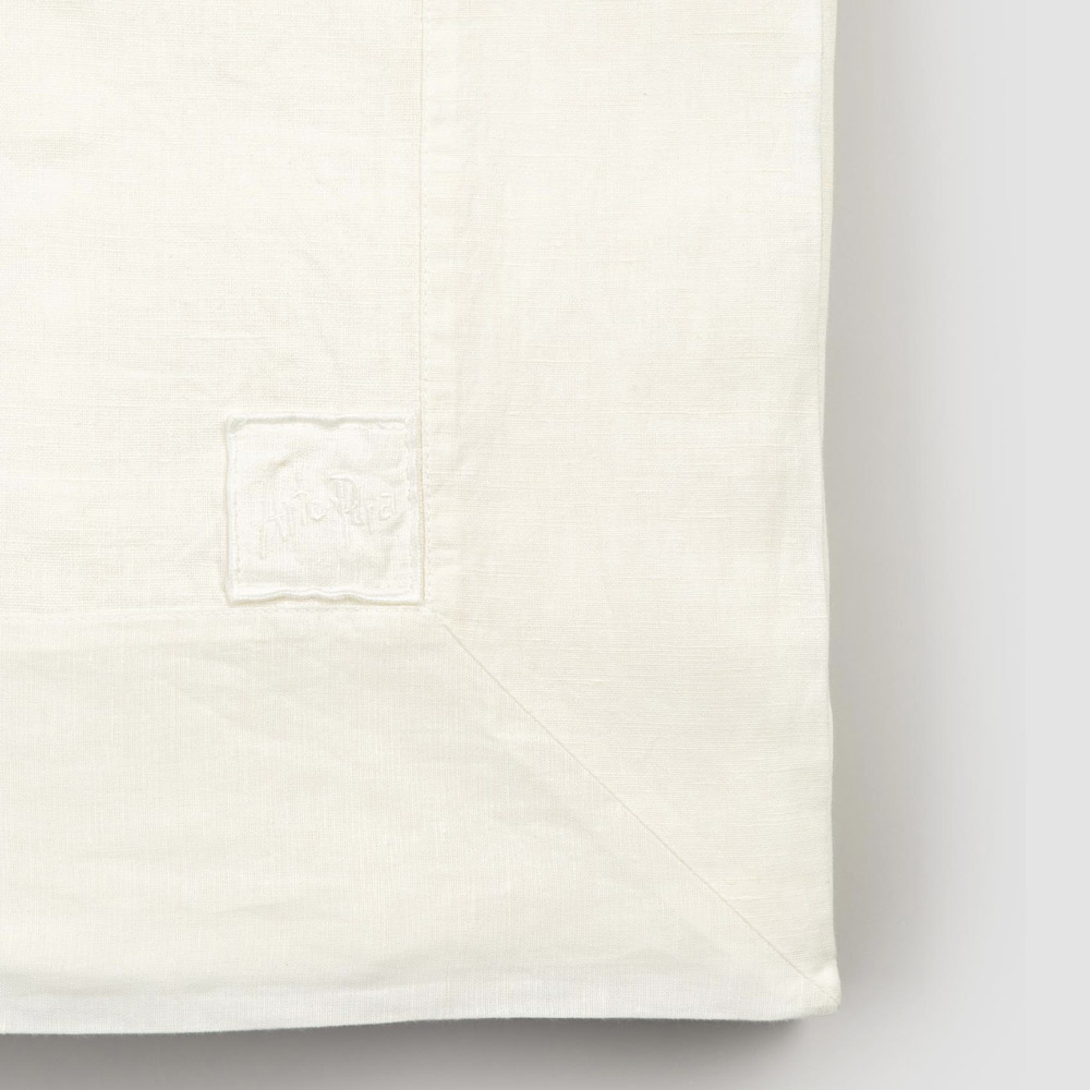 Rectangular tablecloth in natural white linen with framed edges, luxury handcrafted design made in Italy.