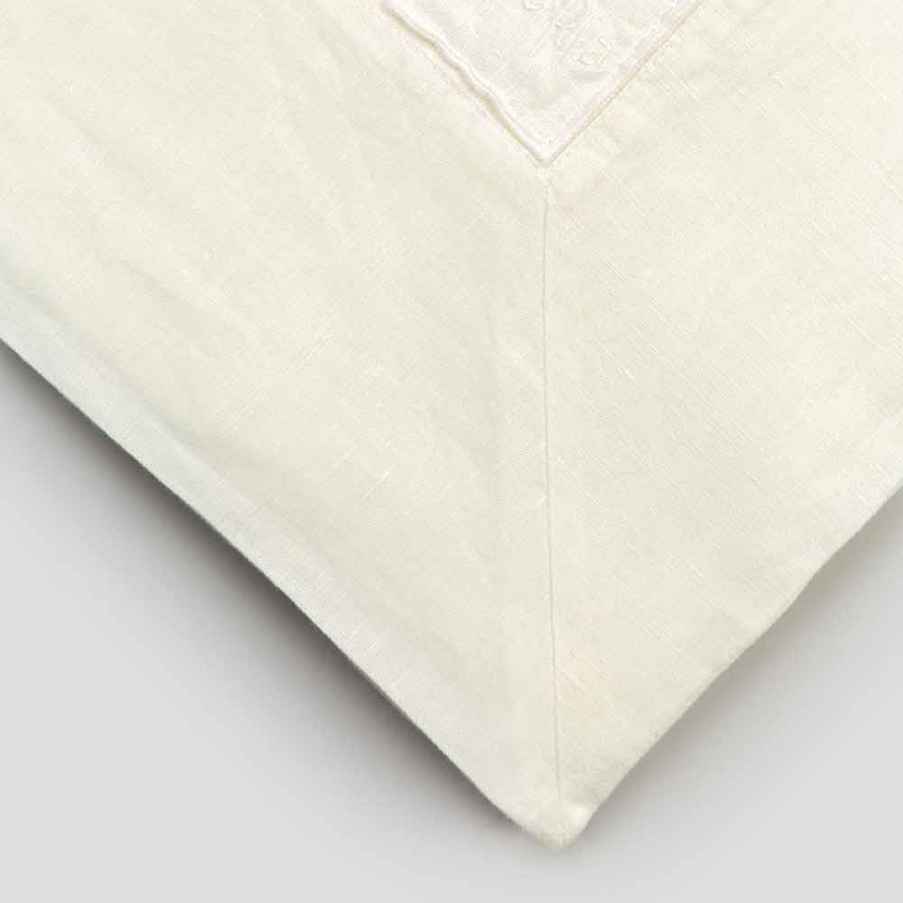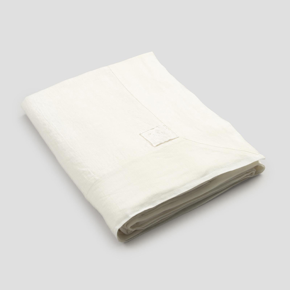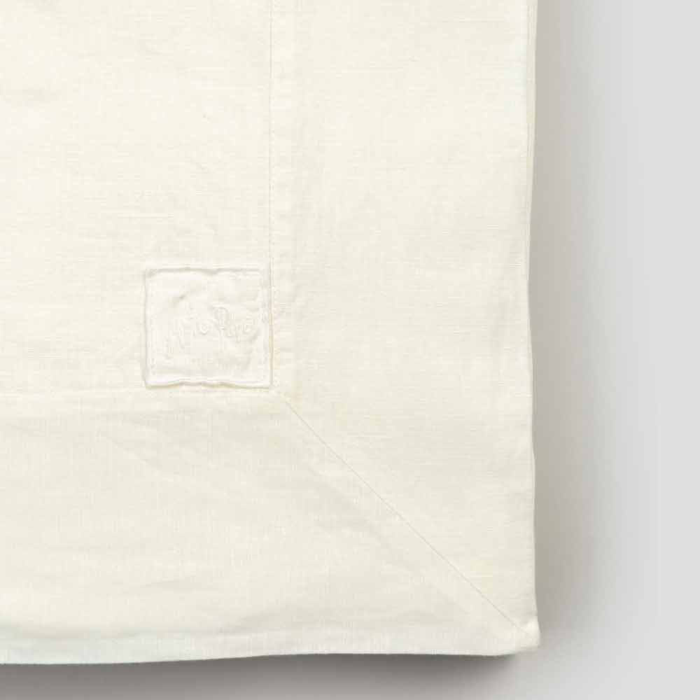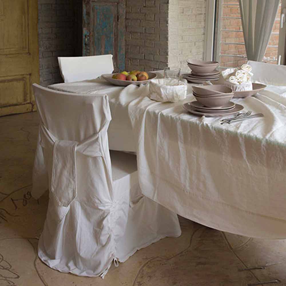 Rectangular tablecloth in natural white linen with framed edges, luxury handcrafted design made in Italy.