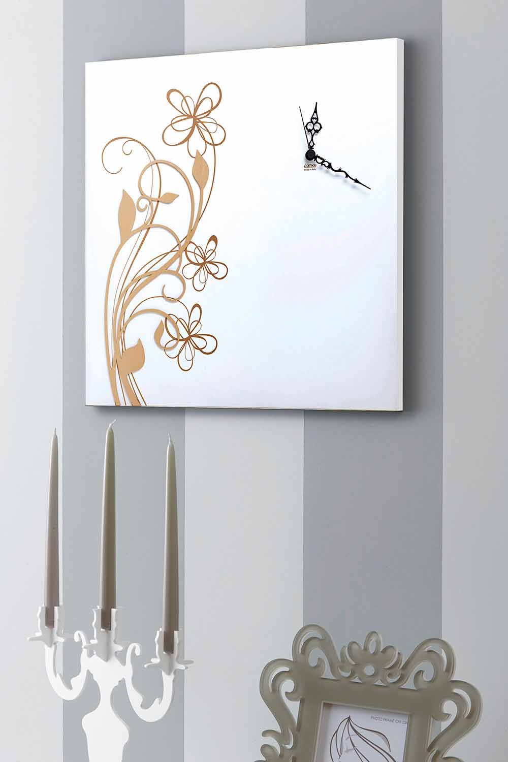 The square clock in white lacquered wood presents a sophisticated and classy style, thanks to the floral decoration in natural wood , designed to decorate the rooms of the house with elegance and grace.