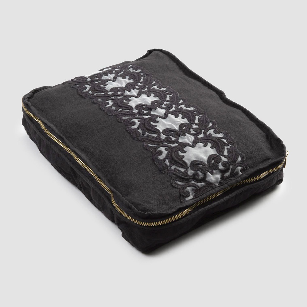 Rectangular linen and cotton cosmetic bag with zipper and Farnese lace, made in Italy.