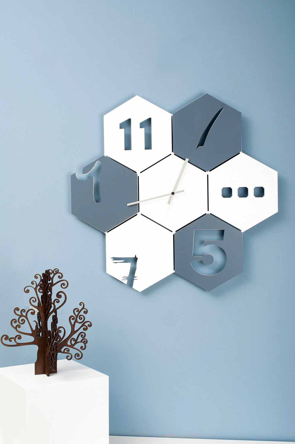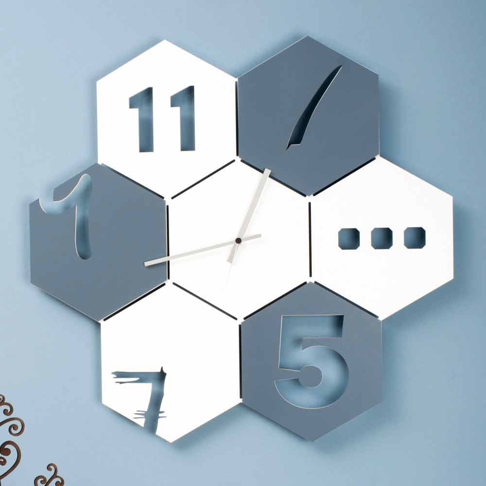 Large wall clock, design composed of white and colored wooden hexagons made in Italy.