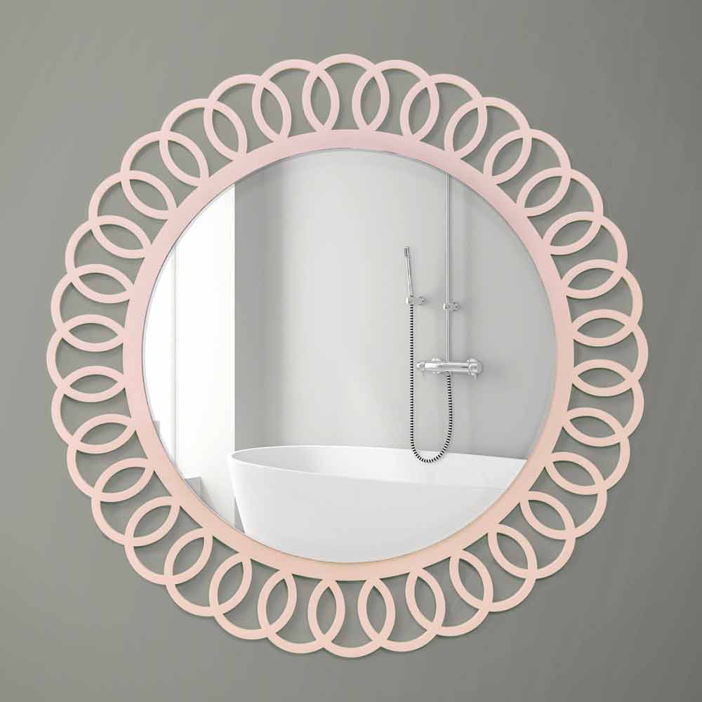 Round wall mirror with pink wooden frame with a modern design made in Italy.