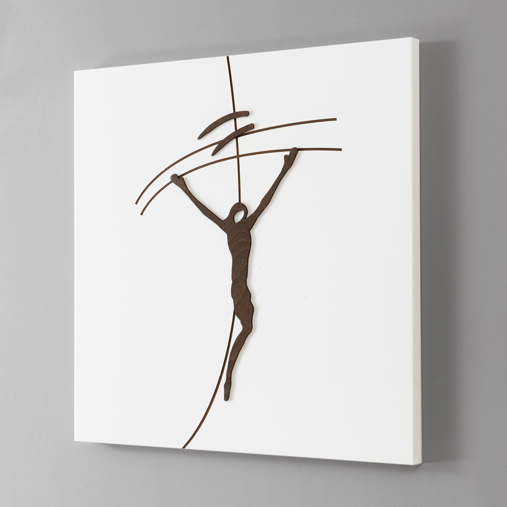 Lacquered wooden picture with laser engraving of the stylized cross and application of Jesus.