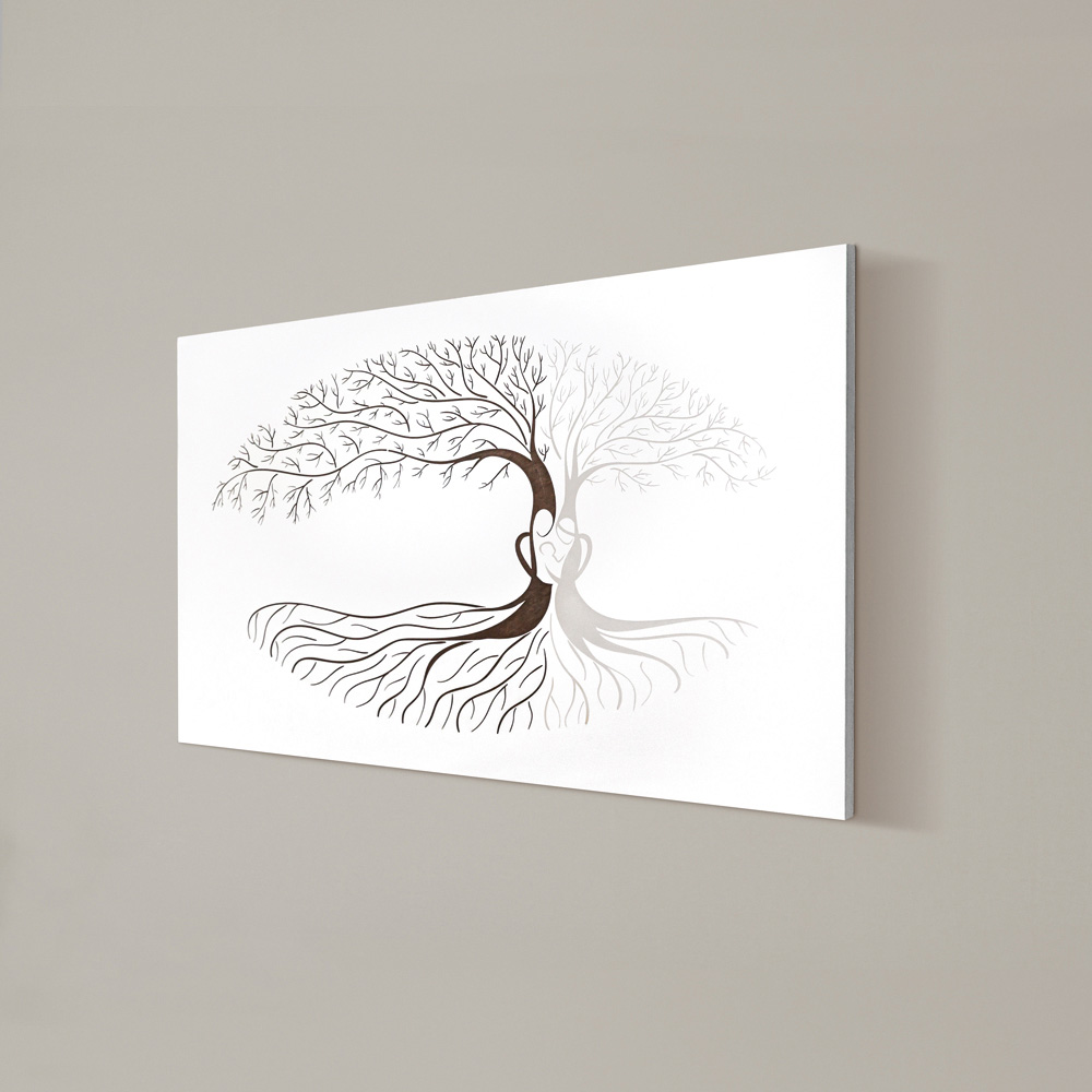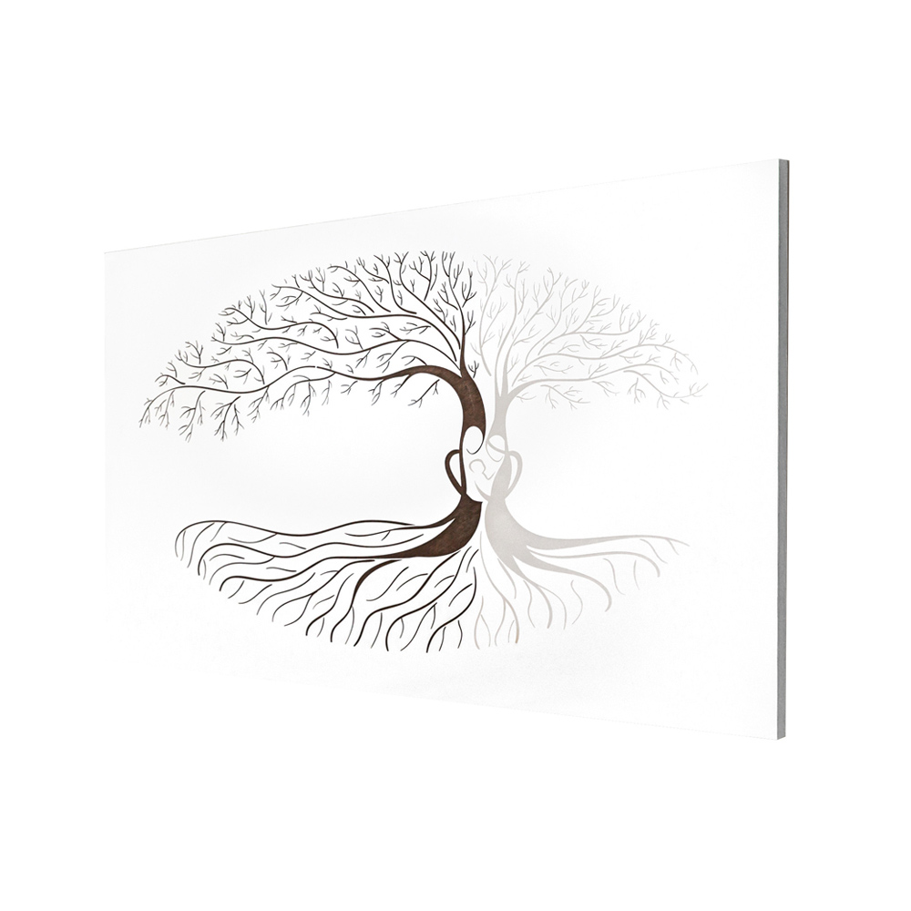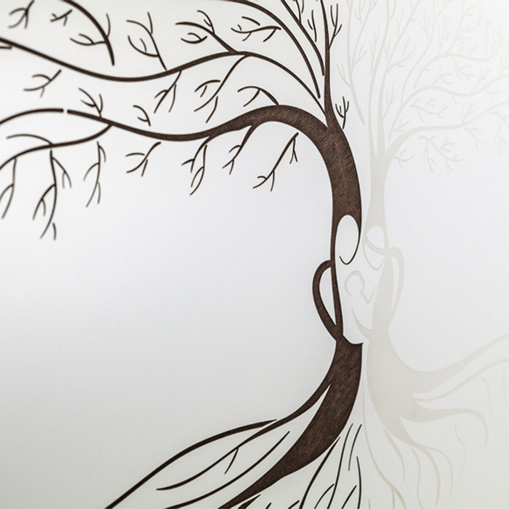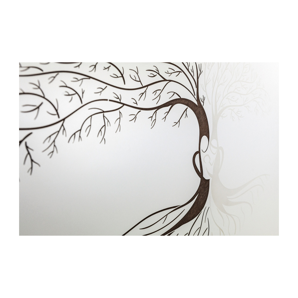 Branches and leaves made with laser marking branch off from the boot. Framework in matt white lacquered wood with applications in lacquered wood in two shades and laser marking.
