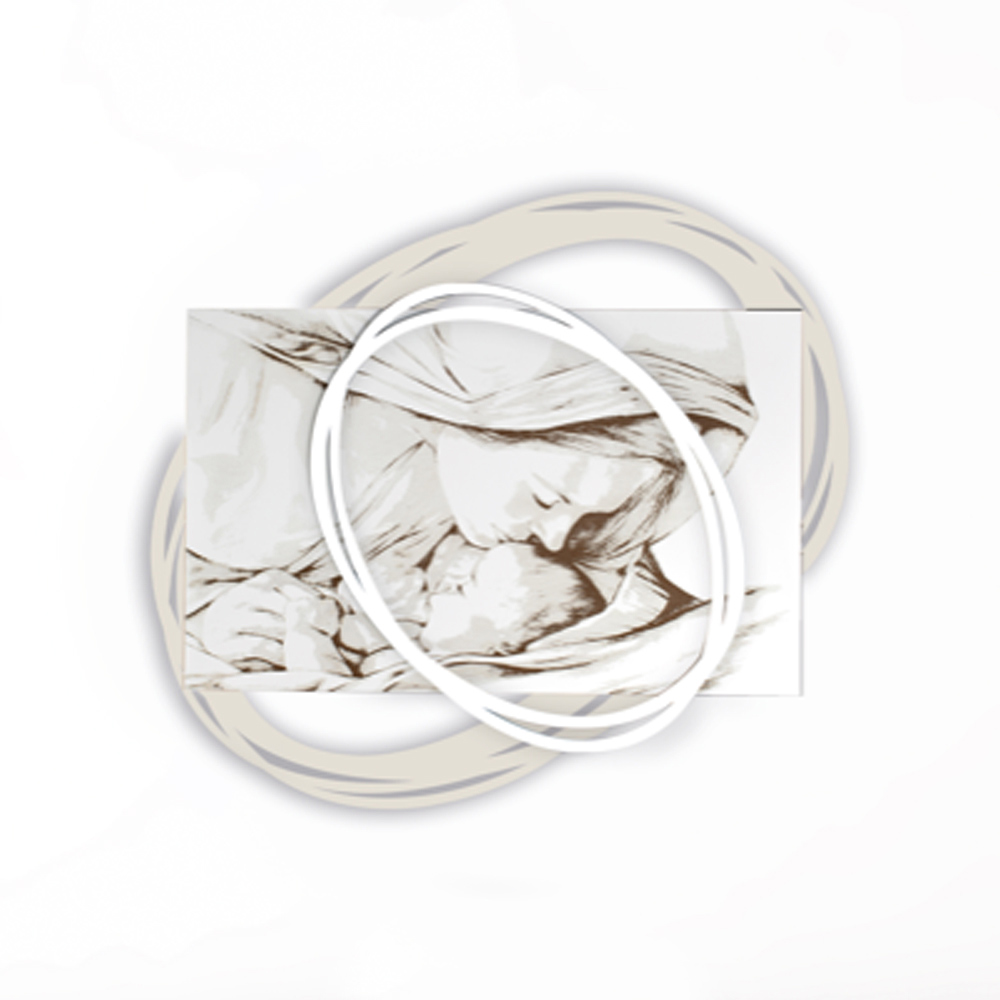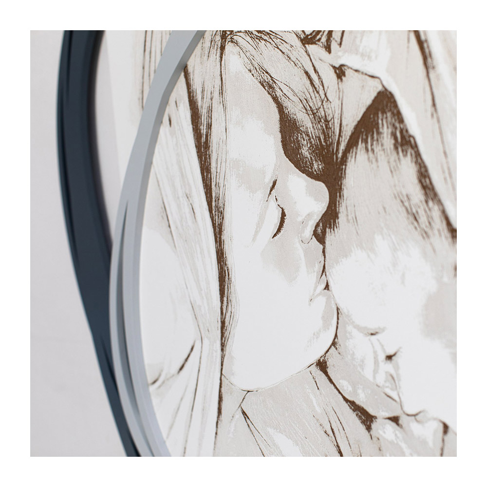 A headboard depicting a kiss from the Madonna to her son thanks to laser marking, which shows the features of the faces. Matt white lacquered wooden panel with laser marking, a special technique that creates a bas-relief on the materials.