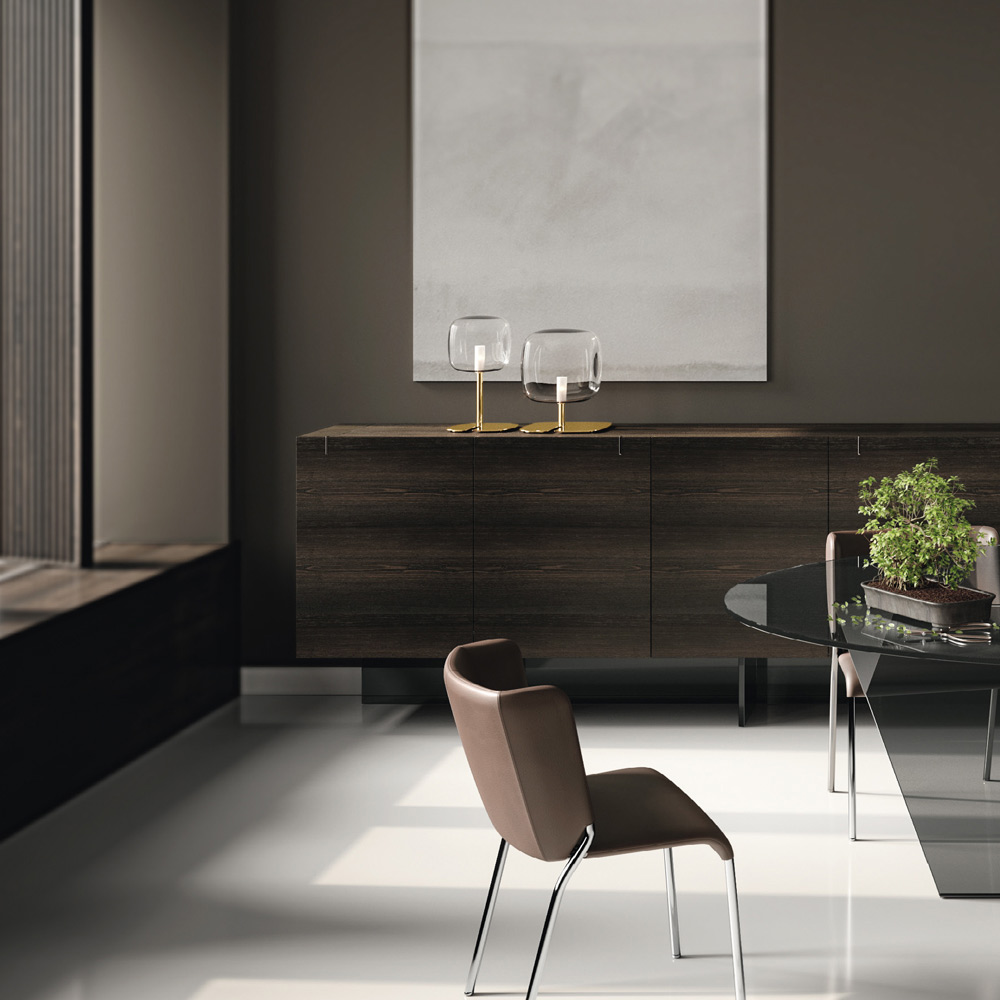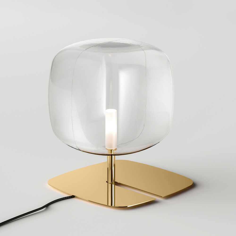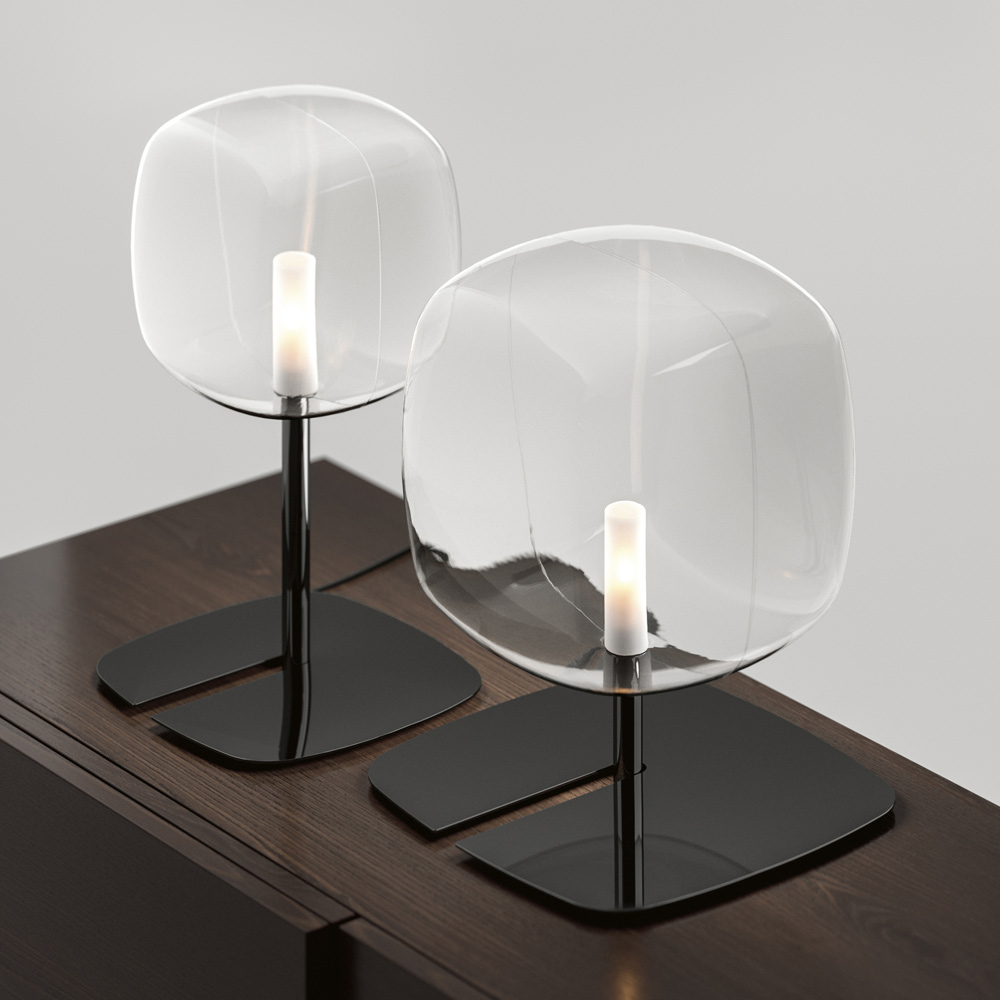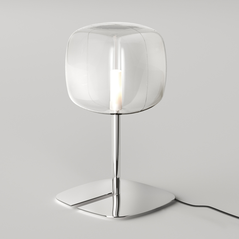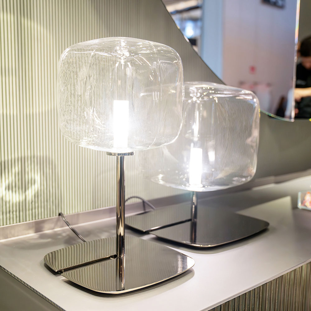 Table lamp entirely made in Italy with cubic lampshade in transparent blown pyrex glass and glossy finish metal structure. An extremely elegant and high-impact lighting idea that helps to create a refined and modern atmosphere within any home environment. Its design is marked by a great formal cleanliness , a feature that allows it to be placed in any area of the house, from the living area to the sleeping area to the study. The two proposed sizes also make it possible to combine the different heights and widths for multiple configurations with a strong stage presence but also for single use as a small design detail inside the room.