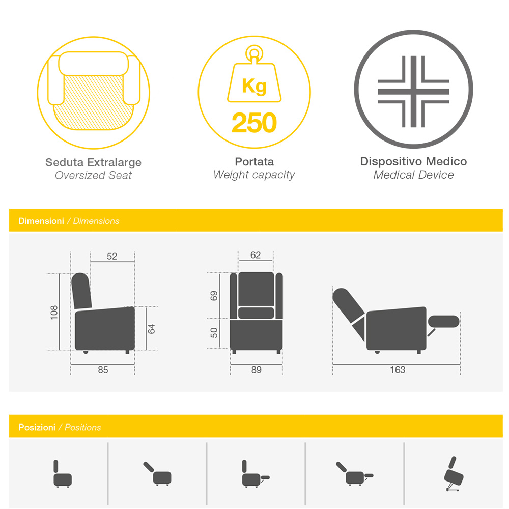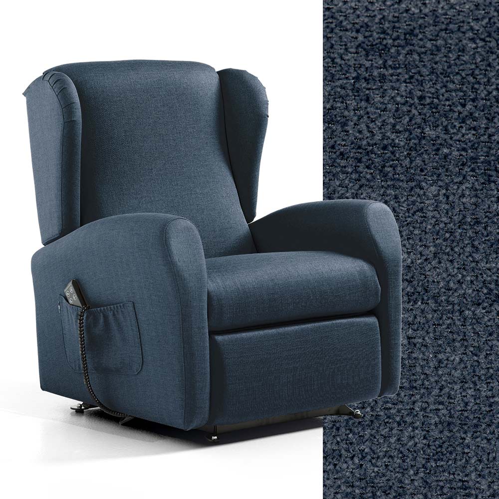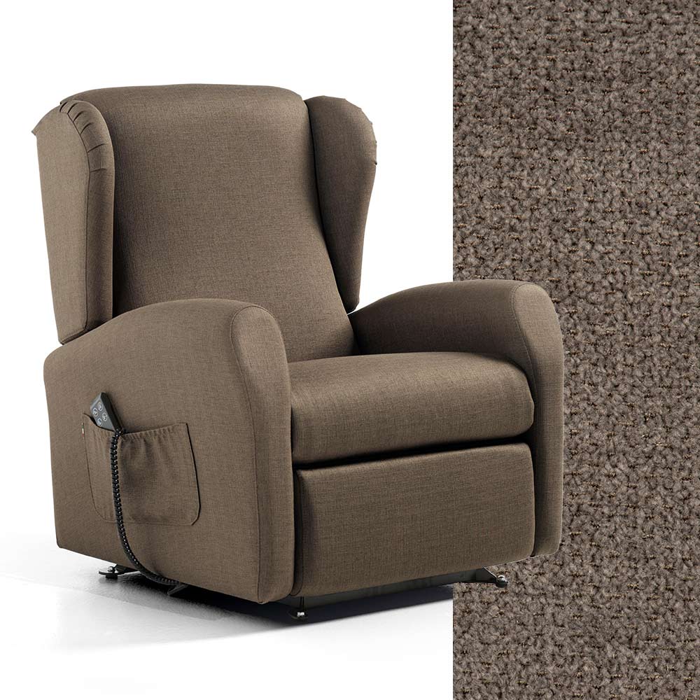 Armchair made with iron and wood structure, padding in non-deformable polyurethane foam with differentiated densities , 3-motor mechanics with Lift/Relax functions, quality fabric with high resistance to wear.