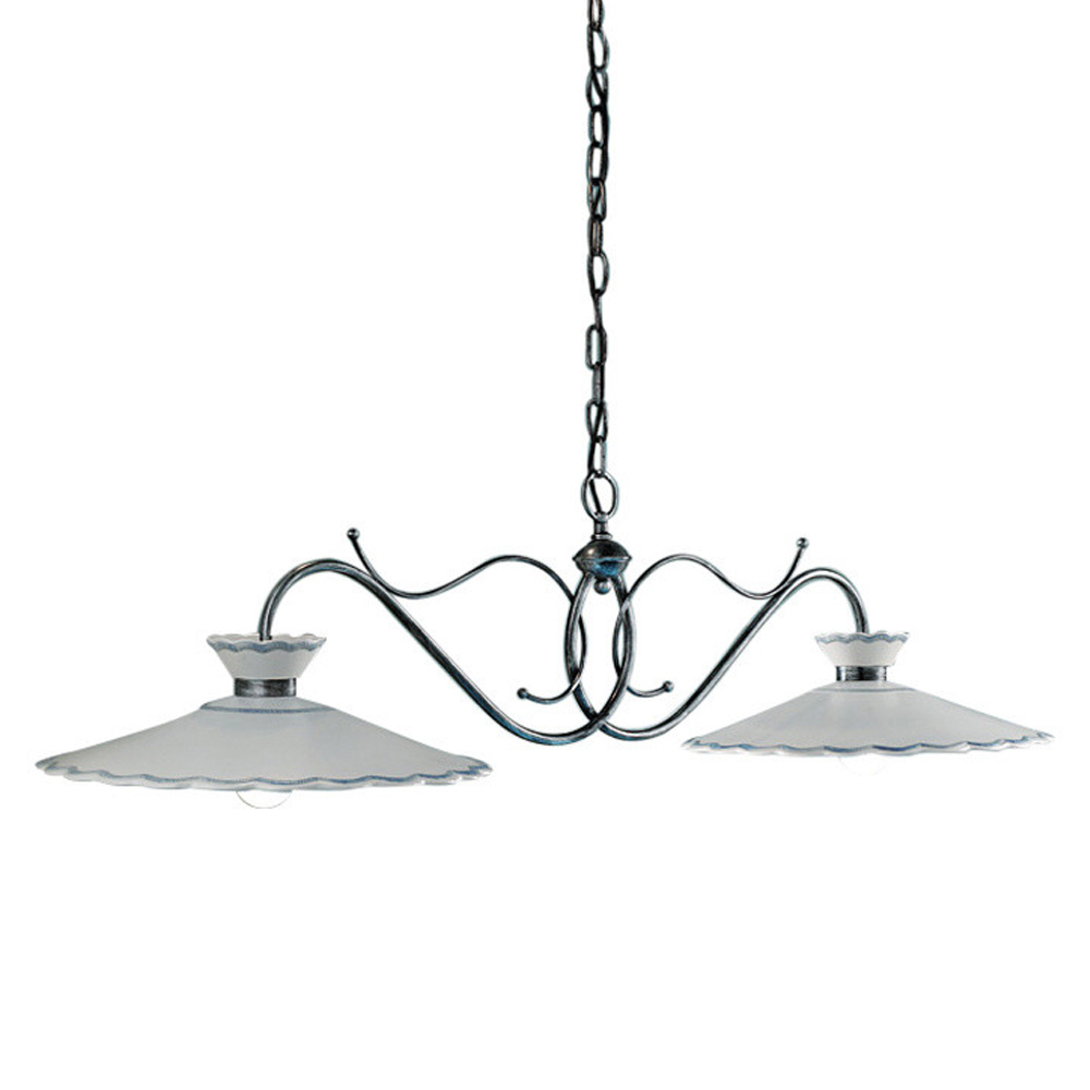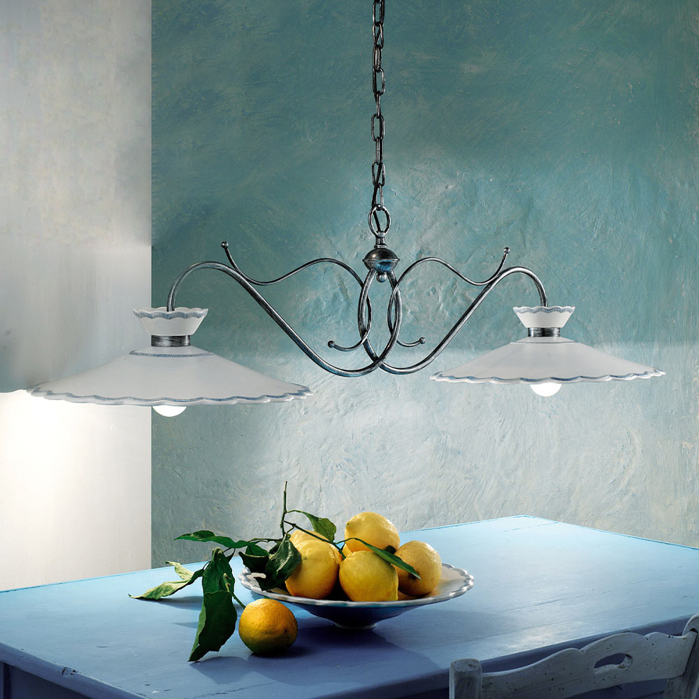 Handcrafted 2-light suspended lamp in metal and ceramic with embroidery effect, 2 sizes made in Italy by Ferroluce.