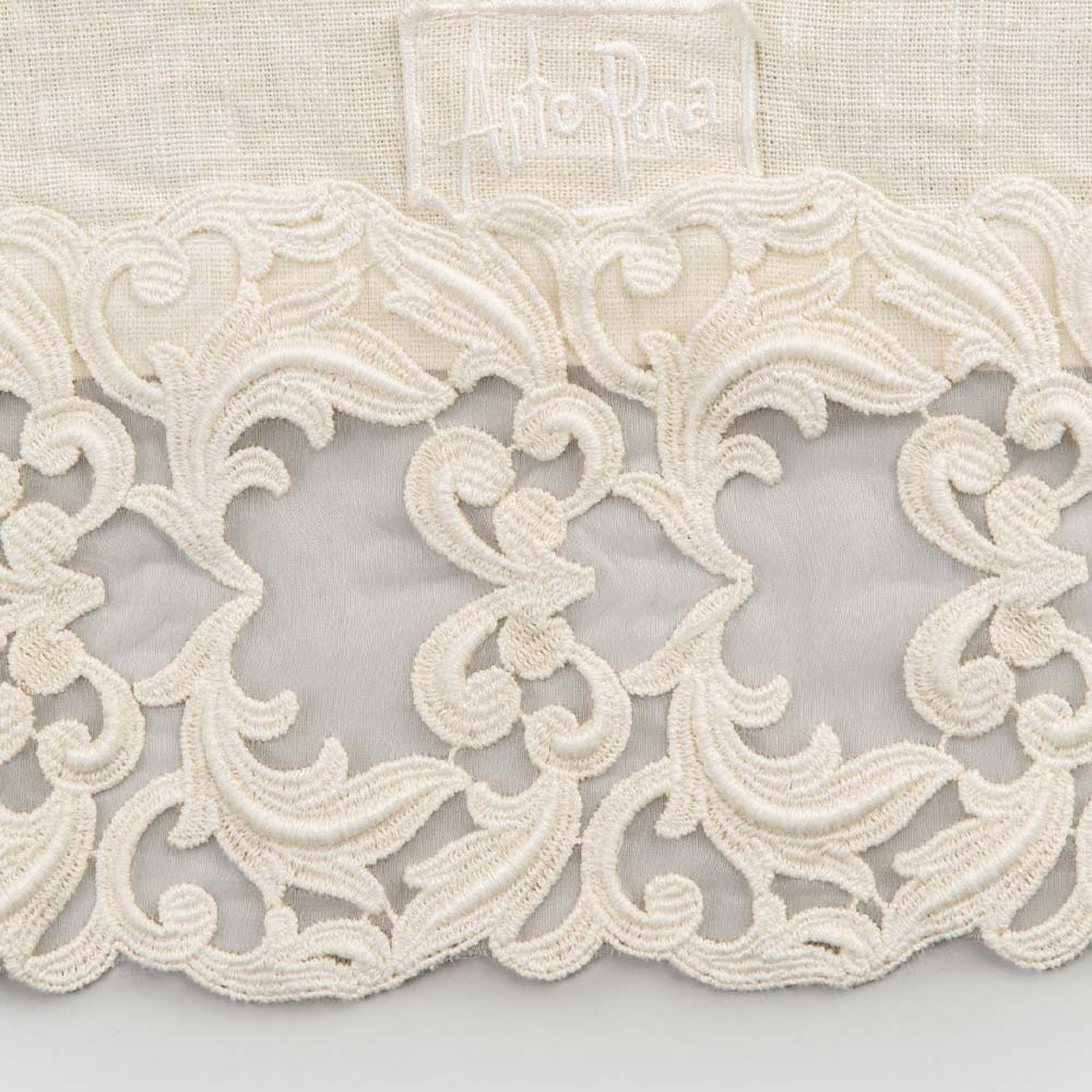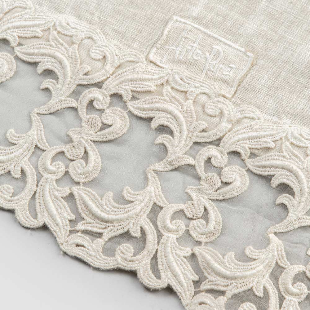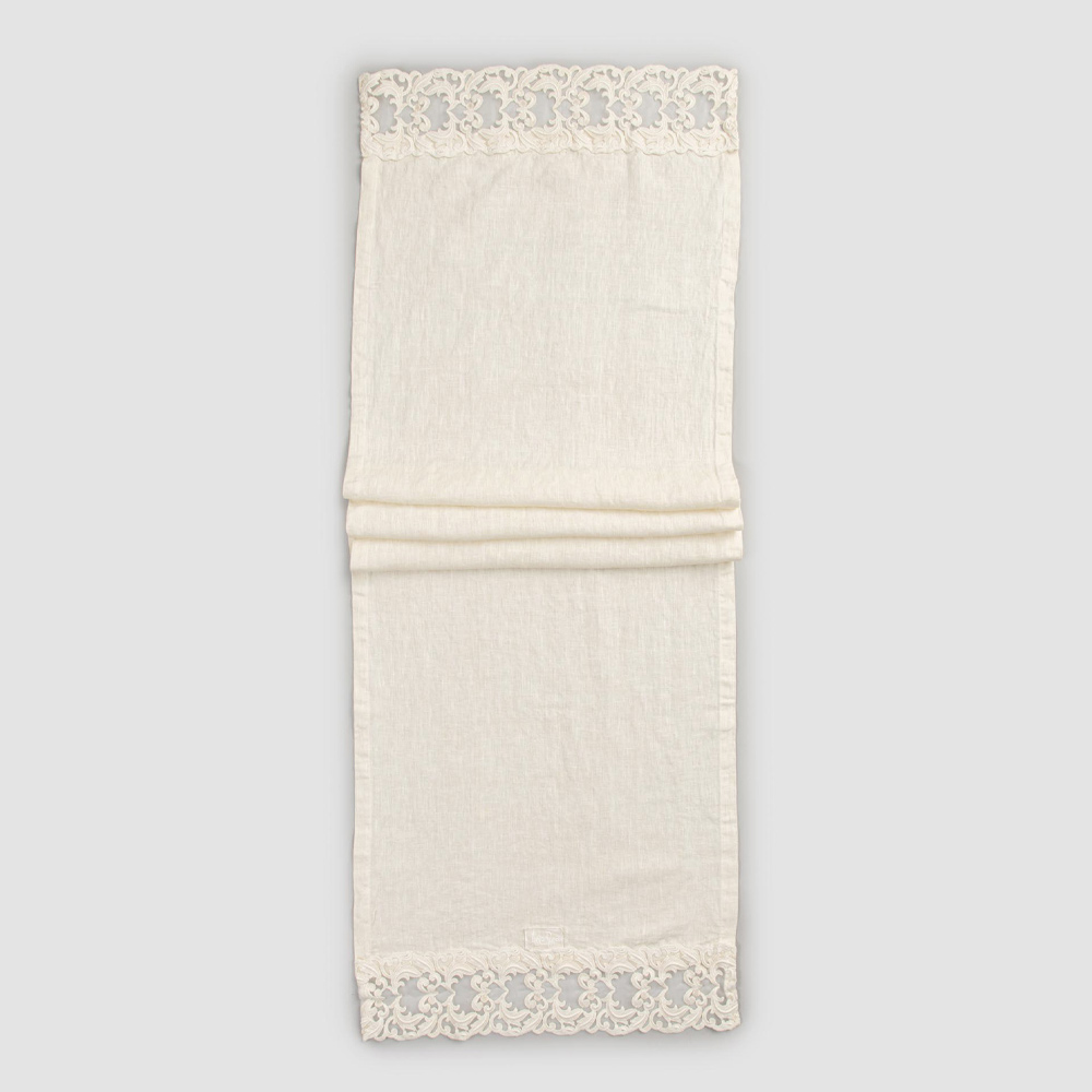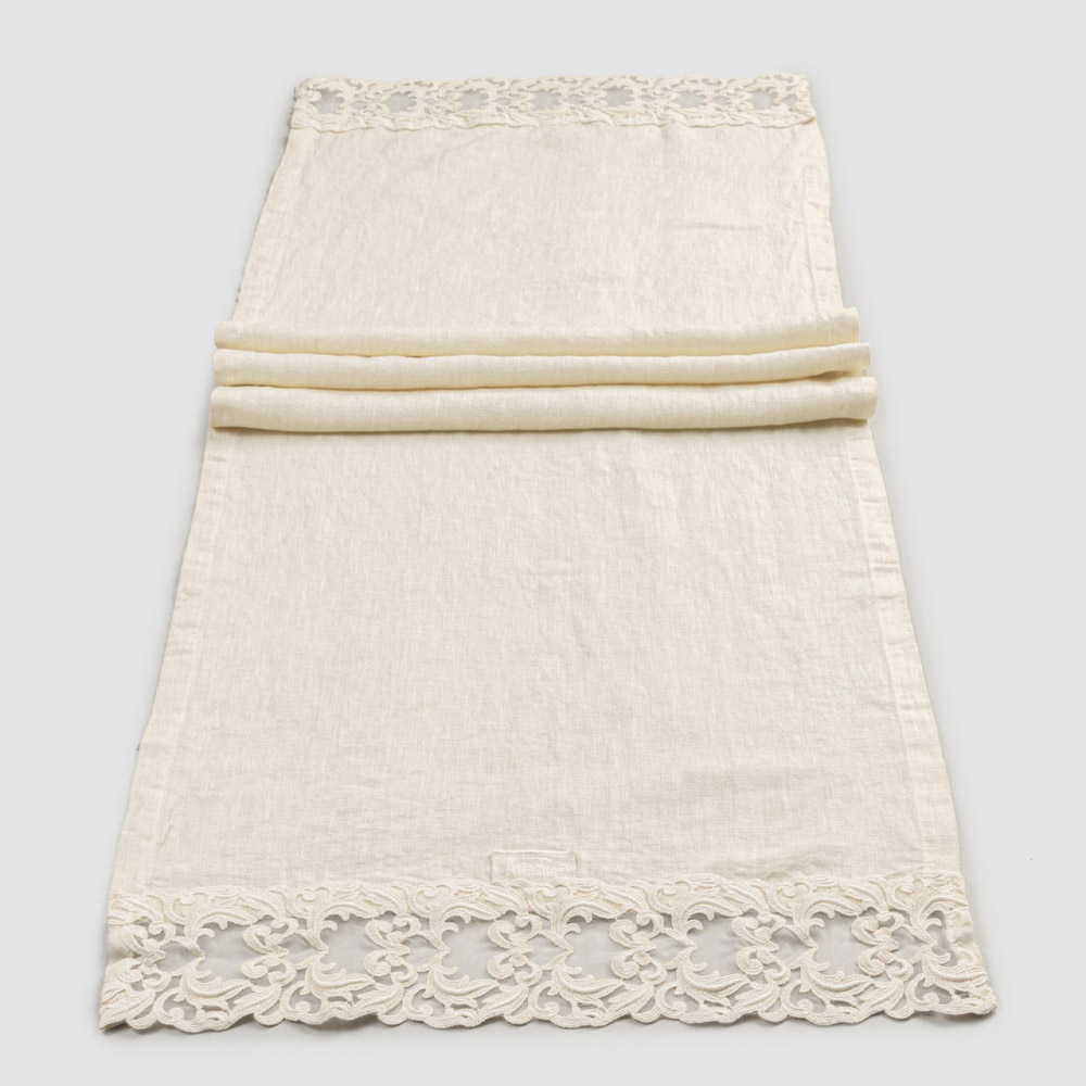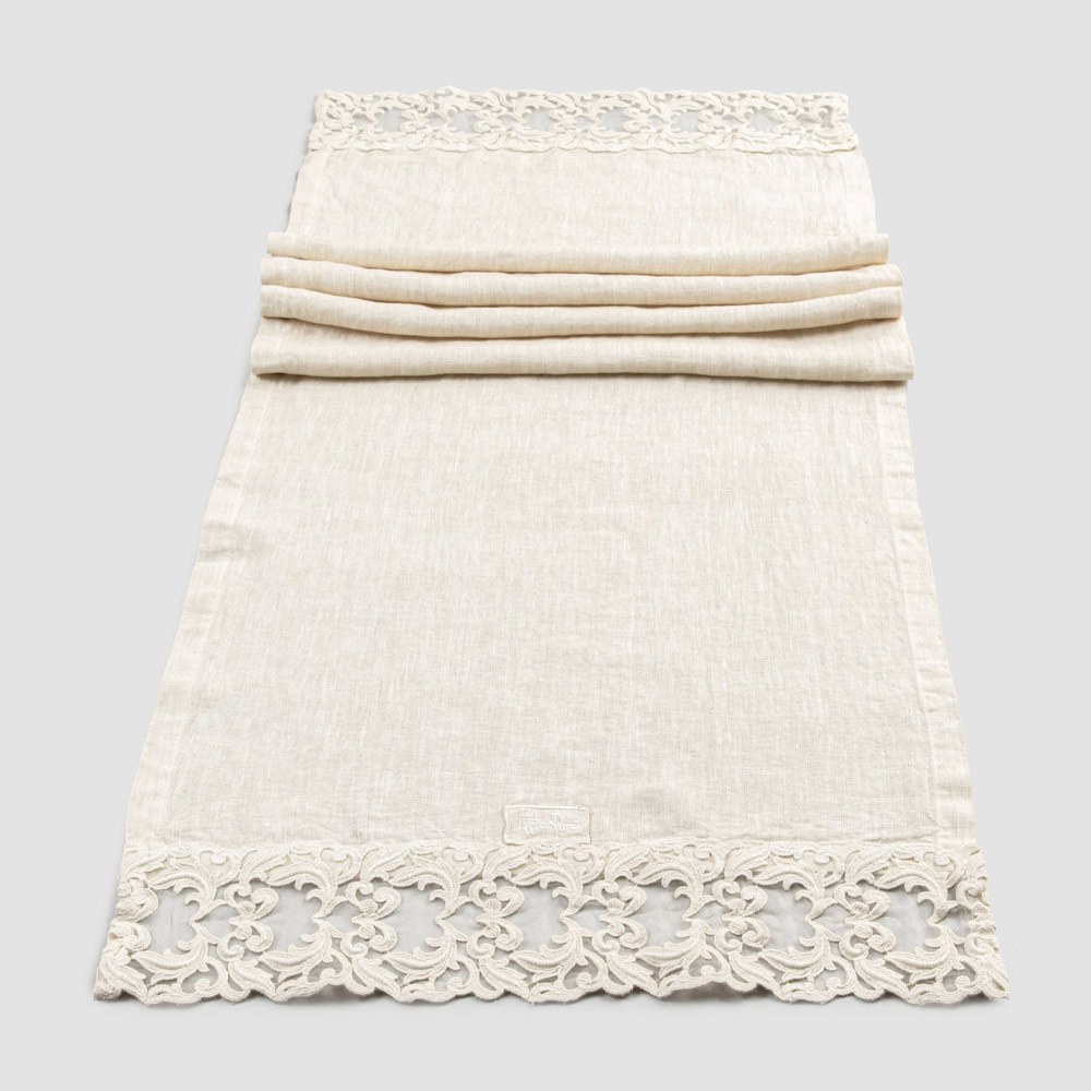 Heavy linen table runner with lace and folded edge, luxury made in Italy.