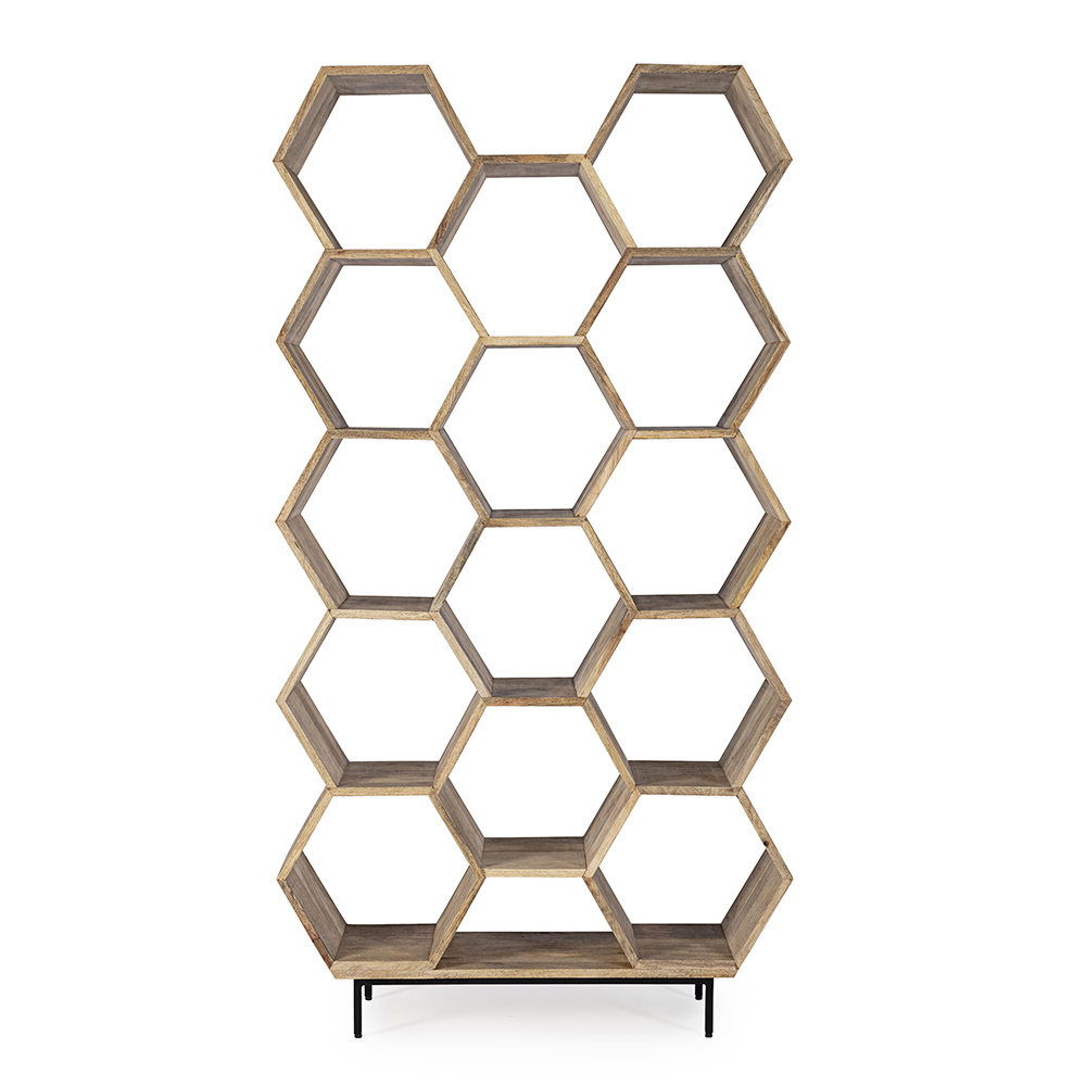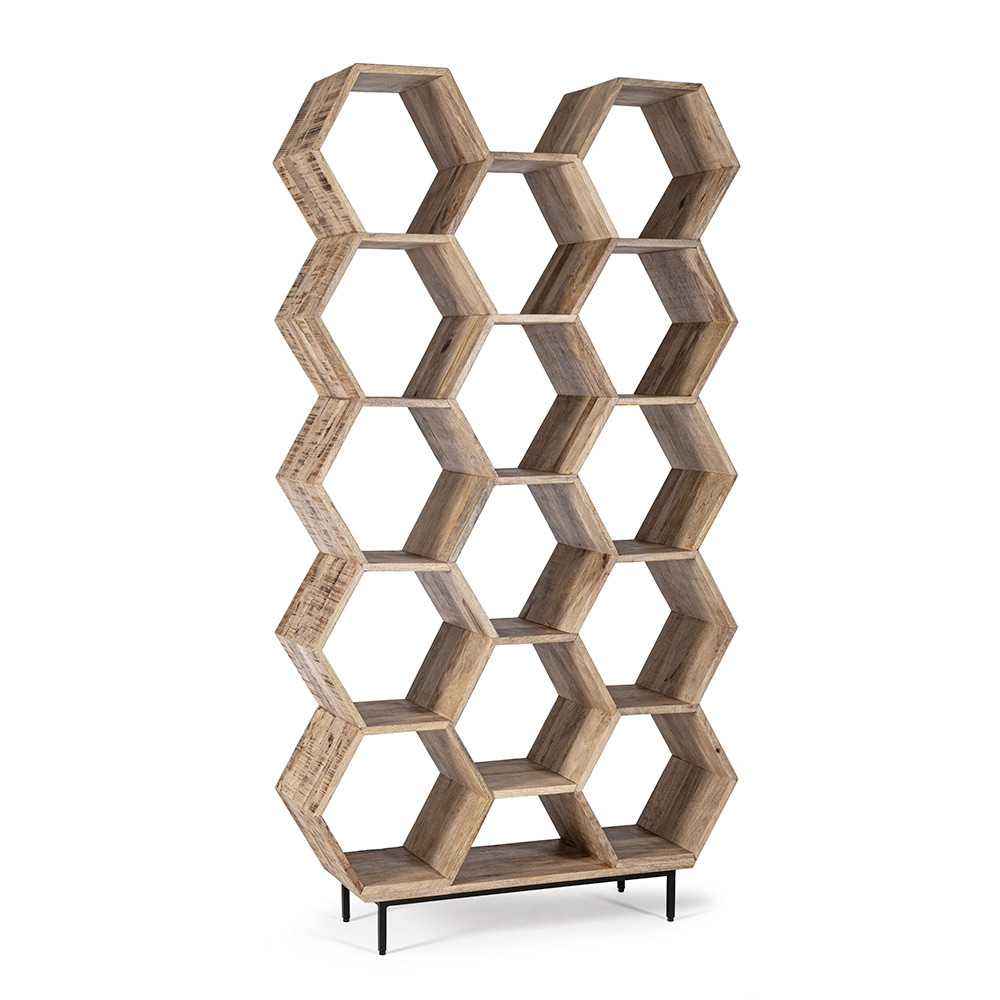 This living room bookcase features a mango wood frame with a polyurethane varnish finish.