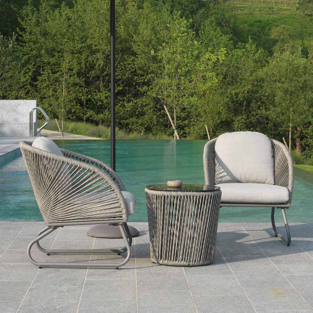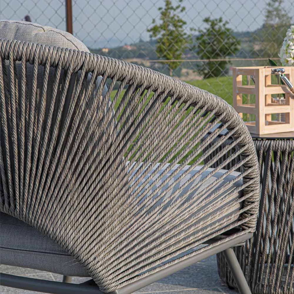 Discover the charm and comfort of our living room , a perfect fusion of style and functionality for your outdoor space. The armchairs offer superior comfort with their padded cushions in shades of grey, ideal for long moments of relaxation under the sun or under the stars.