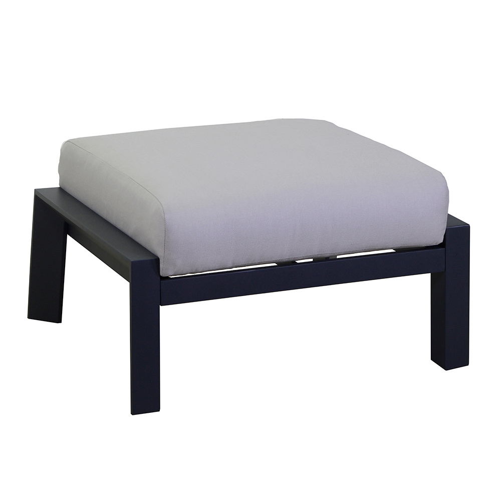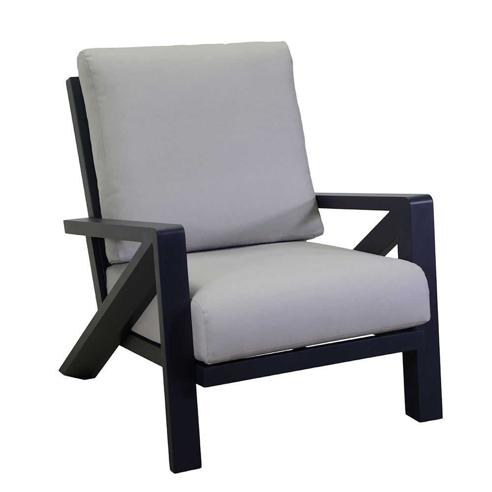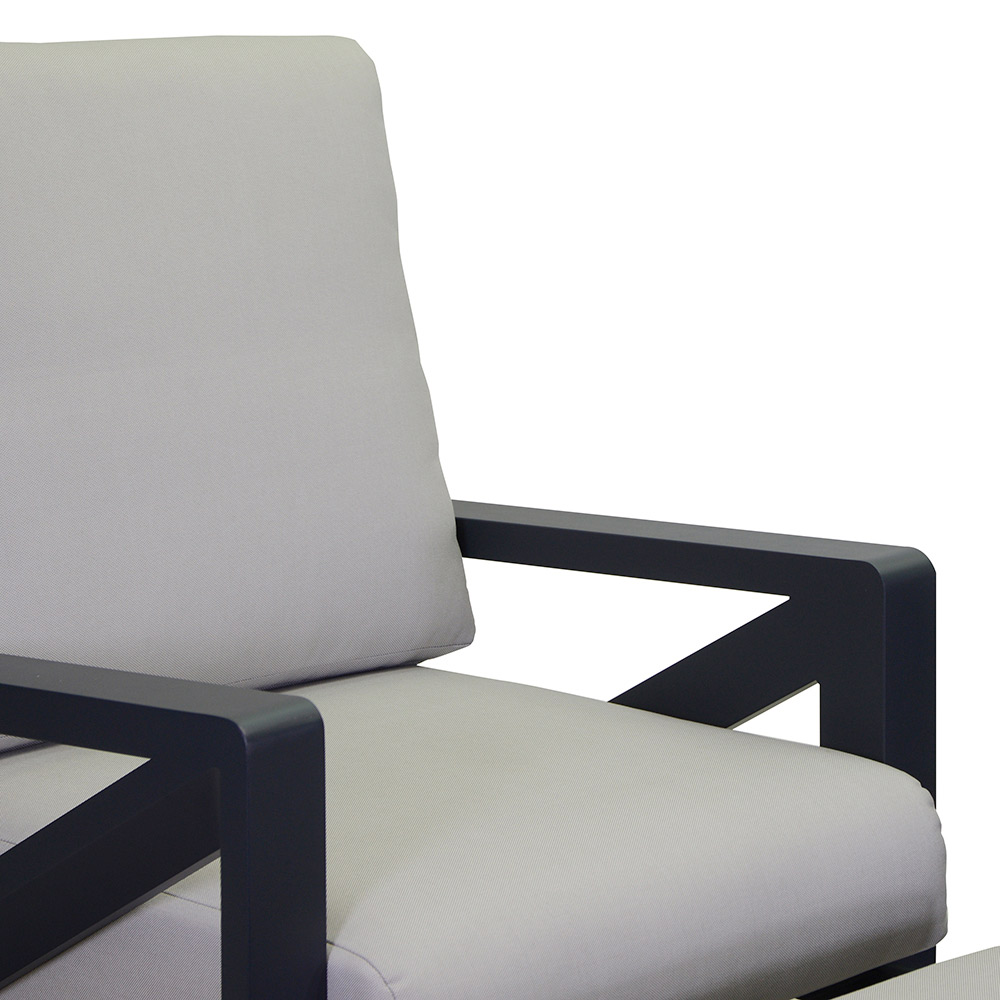 2 armchairs with footrest: frame in rust-proof aluminium, powder-coated in anthracite, water-repellent cushions in light grey Olefin, removable covers.