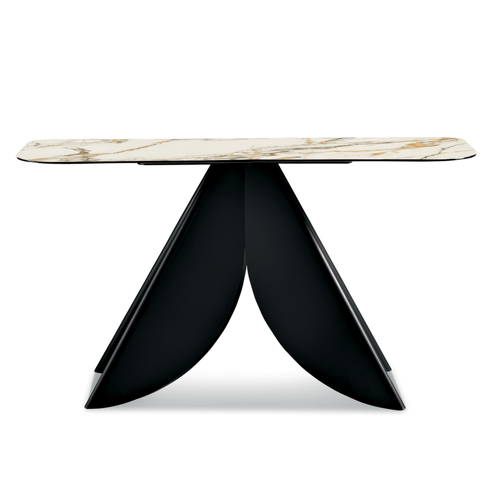 The structure is characterised by a painted metal base composed of four intertwined curved elements that recall the shape of petals, creating a refined, dynamic and scenographic graphic effect.