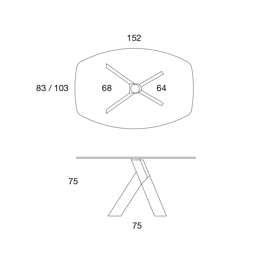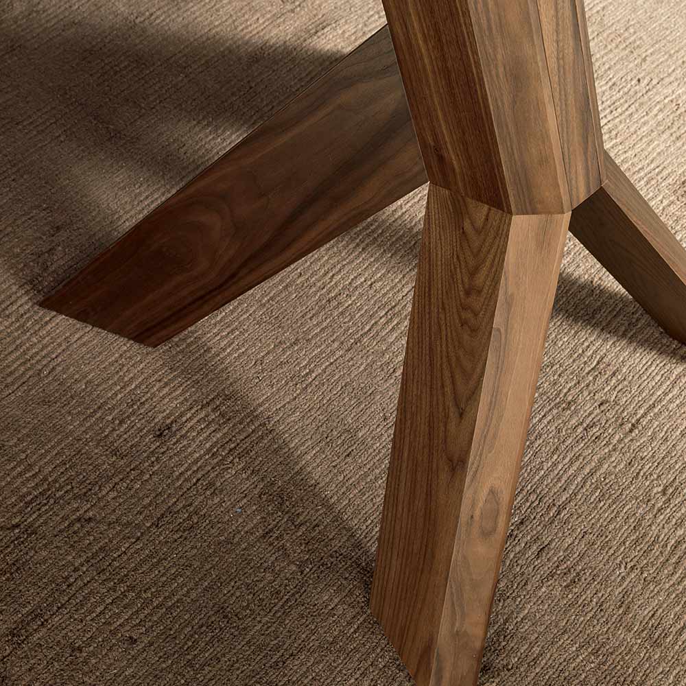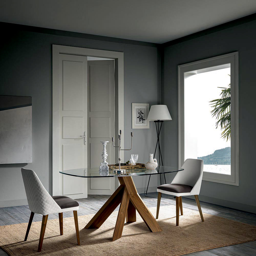 This dining table has a structure with 4 legs in veneered wood with a canaletto walnut finish Ā  and a transparent tempered glass shaped barrel.
