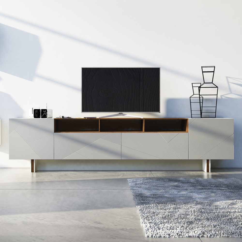 Living room sideboard with matt lacquered MDF structure consisting of 2 hinged doors and 2 drawer doors that guarantee great functionality and practicality. The oak display case and the light grey matt lacquered plinth with oak inserts are included. This product is characterized by taste and design thanks to its elegant and refined finishes and the decoration engraved on the doors which is unique in its kind. The various materials used for the construction offer great quality and resistance over time, giving the product that unique and unforgettable touch.