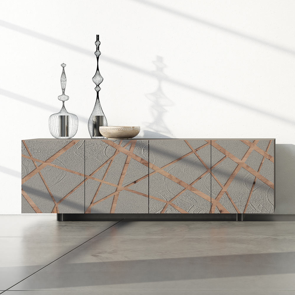 Living room sideboard with mud-coloured matt lacquered MDF structure. The opening system has 4 coplanar sliding doors and is amortized in opening and closing to guarantee perfect functionality and practicality . The internal shelves are removable and in 8 mm thick glass and also includes a plinth . This product is full of taste and design thanks to the union of various materials, its elegant and refined finishes and embellished by the decoration on the door with oak bas-relief . All the materials used for the construction offer great quality and resistance over time, giving the product that unique and unforgettable touch.