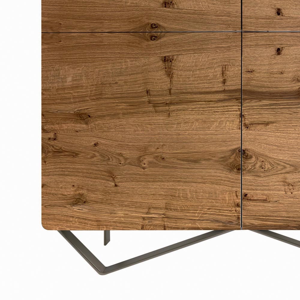 Living room sideboard completely made in Italy composed of a base with 2 iron feet in nickel finish , shell in coal finish mdf , back in solid wood complete with 4 doors in knotty oak blockboard with country oak finish with internal shelves in mdf . The use of simple but resistant materials transforms this product into a piece of furniture with great versatility and an attractive and interesting appearance.