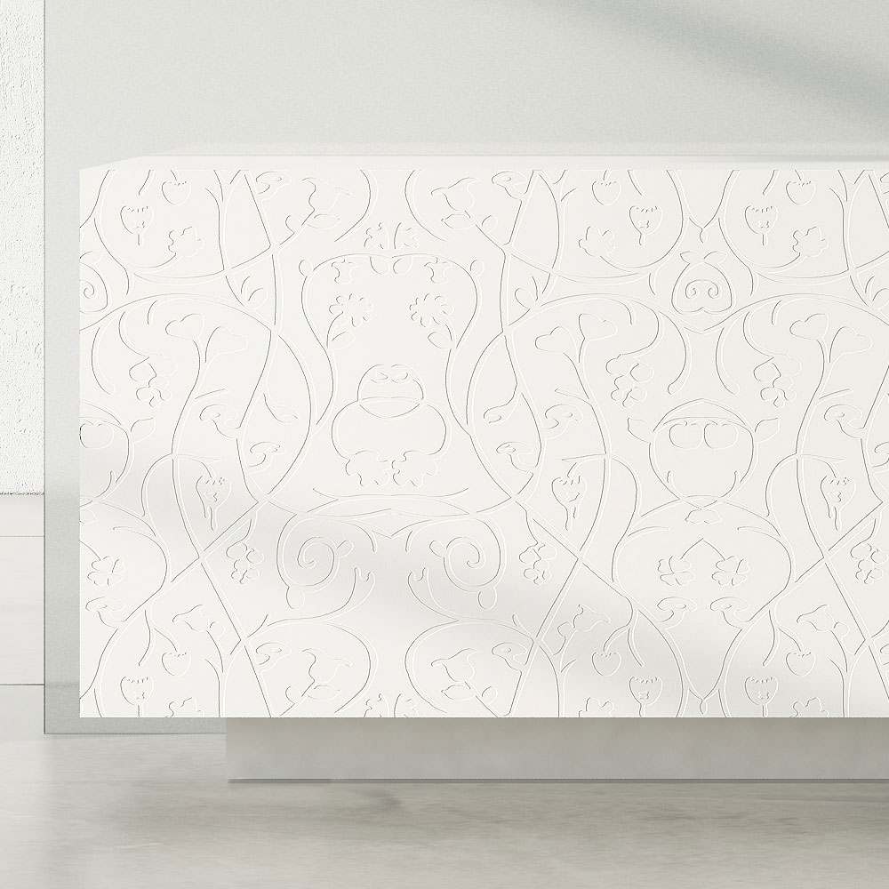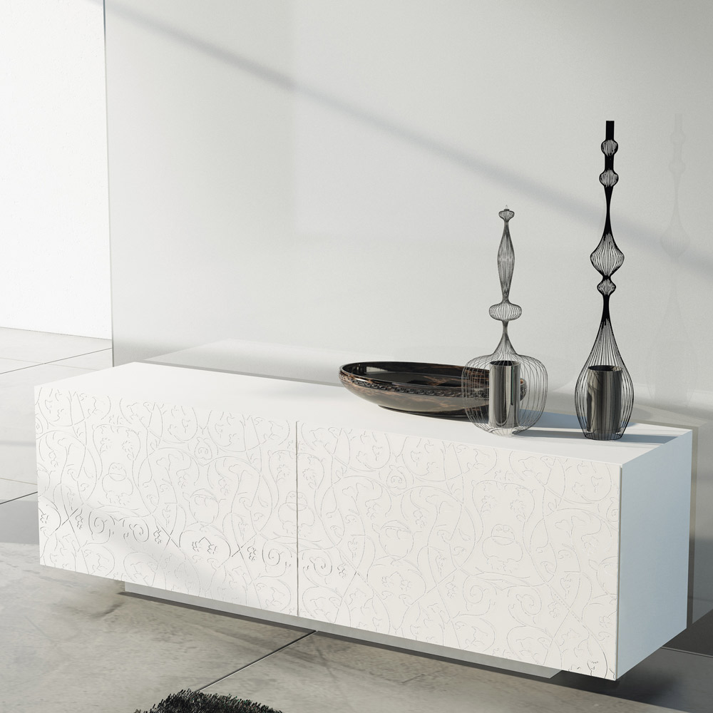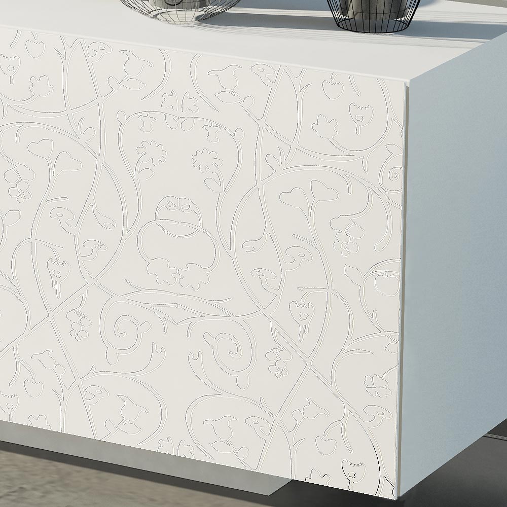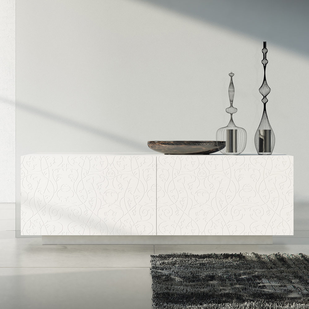 Modern sideboard with white matt lacquered MDF structure composed of 2 coplanar sliding doors which guarantee great functionality and practicality and from the lacquered plinth which offers a lot of stability. This product is full of taste and design thanks to its elegant and refined finishes and the bas-relief decoration of the doors which makes them unique in their kind. The various materials used for the construction offer great quality and resistance over time, giving the product that unique and unforgettable touch.