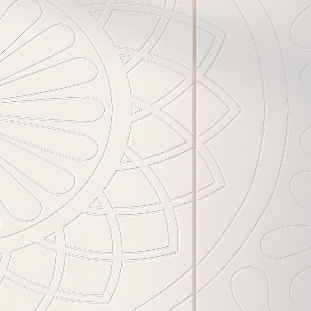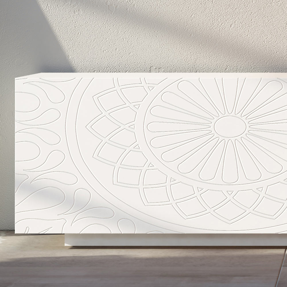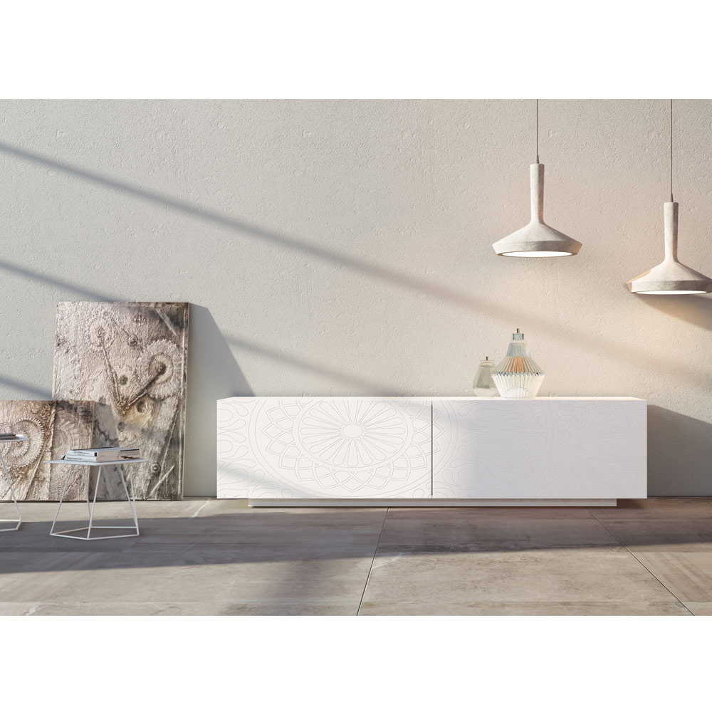 Modern sideboard with white matt lacquered MDF structure composed of 2 coplanar sliding doors which guarantee great functionality and practicality and from the lacquered plinth which offers a lot of stability. This product is full of taste and design thanks to its elegant and refined finishes and the bas-relief decoration of the doors which makes them unique in their kind. The various materials used for the construction offer great quality and resistance over time, giving the product that unique and unforgettable touch.