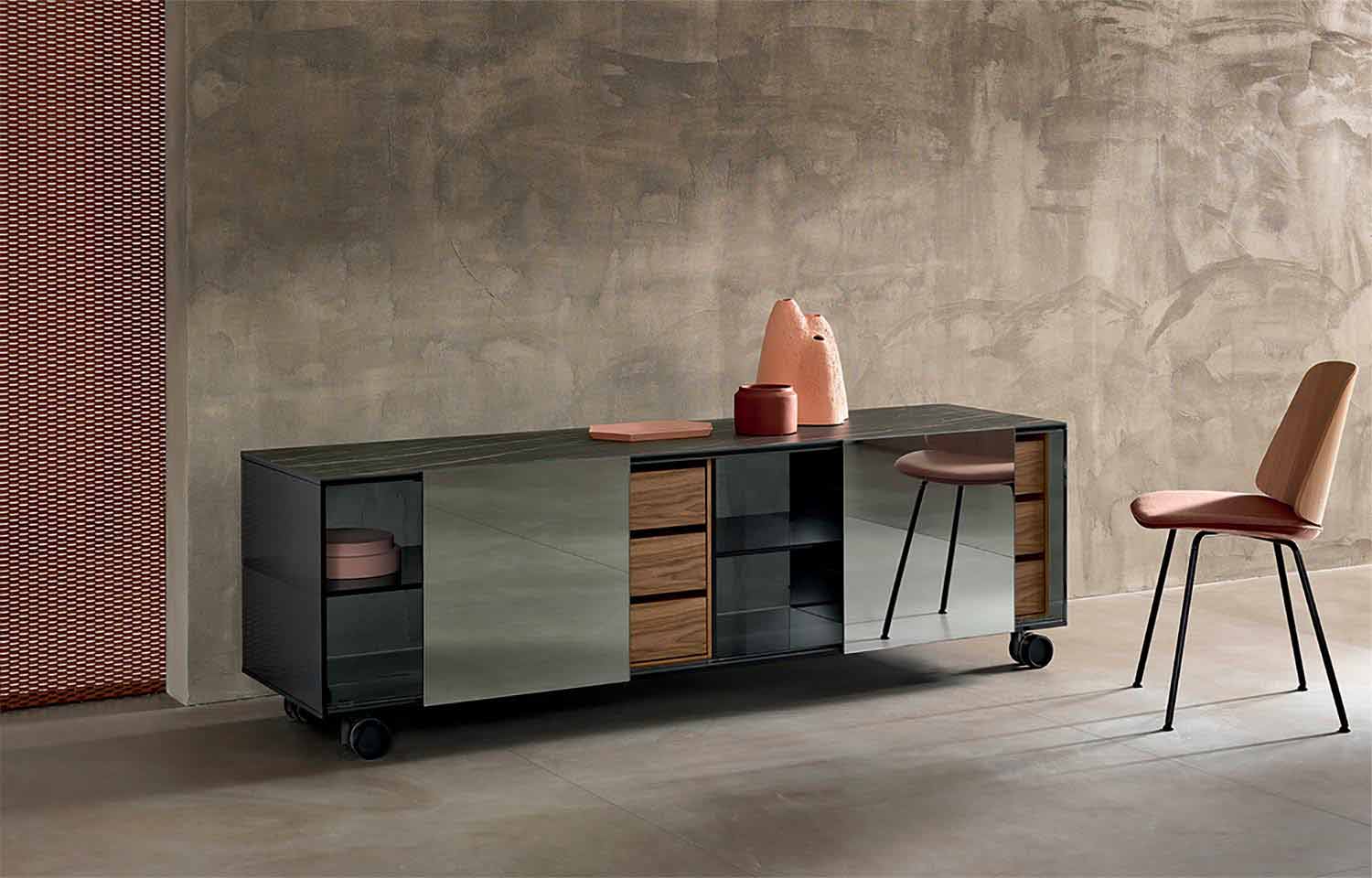 The lounge sideboard Scocca is realized by hand in Italy with high-quality materials.