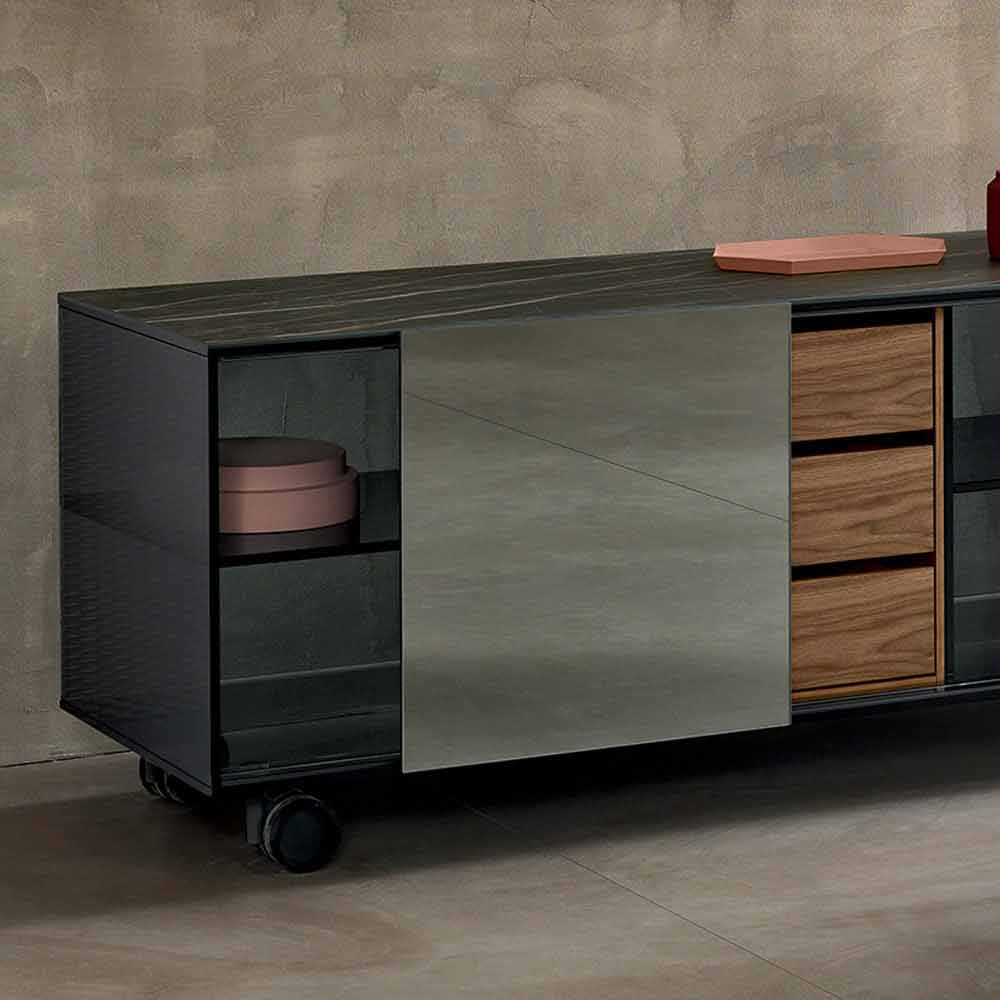 Modern style lounge sideboard on wheels with a smokey glass structure and a Noir Desir ceramic top, realized by hand in Italy.