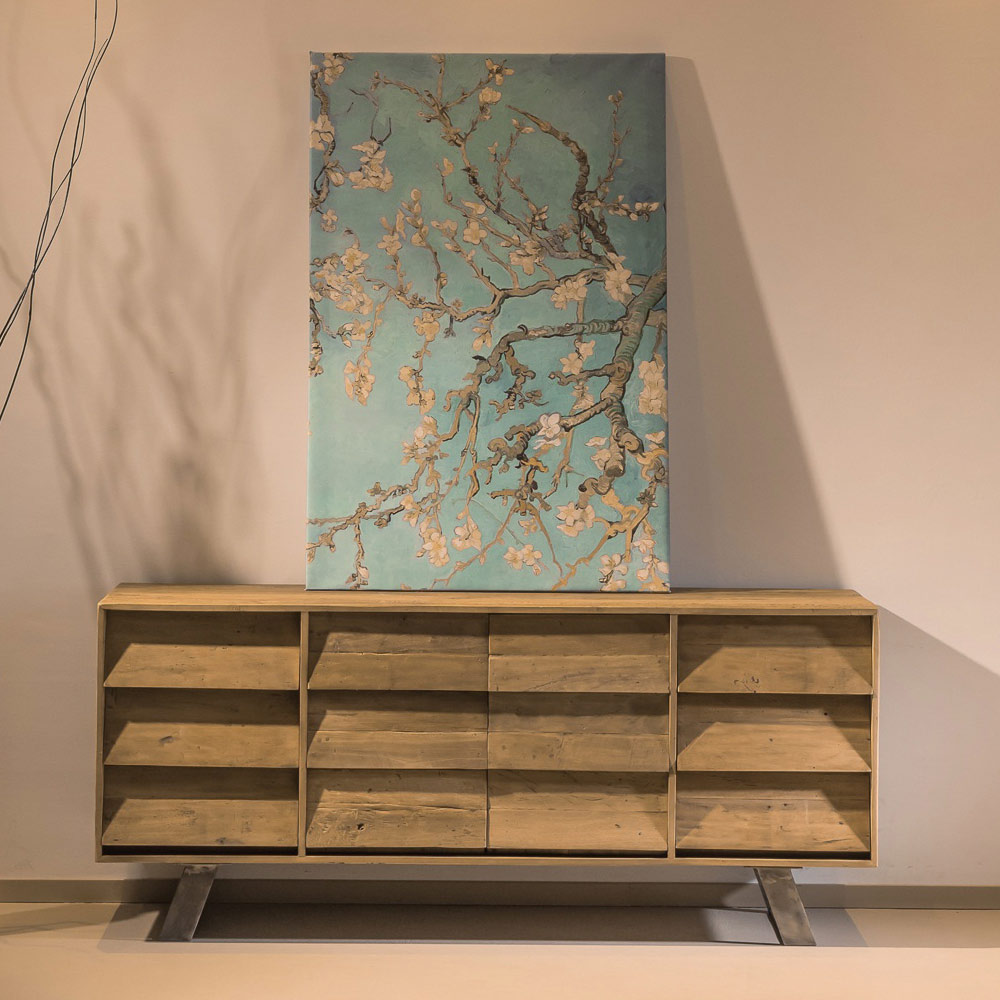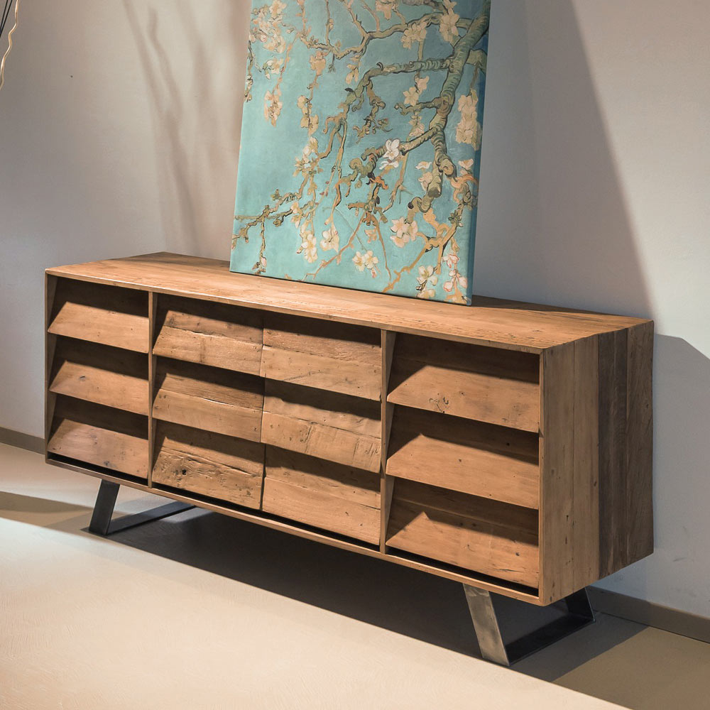 This furniture set è literally unique precisely because it encapsulates the peculiar history of the lived-in material. The workmanship is largely done according to handcrafted procedures. Every nick and imperfection, every scar on the wood, testifies to the originality of a past that is given new life. The recycled tropical wood legally from old artifacts, boats and abandoned buildings is expertly treated and brushed in order to regain dignity and luster. This product combines the’essence of rustic taste with the forms of contemporary design and some details of industrial style.