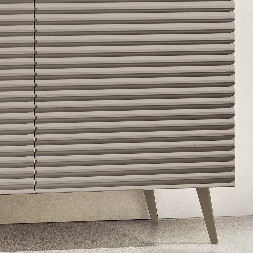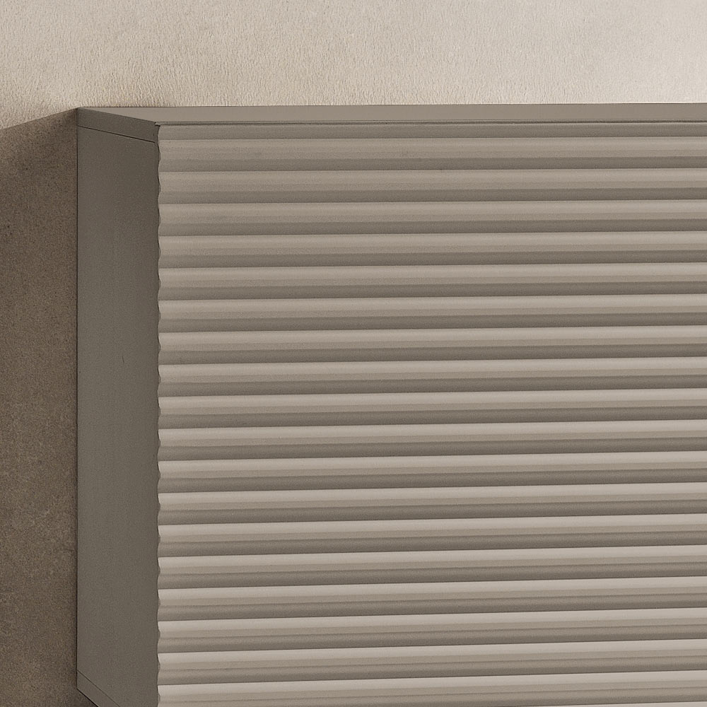 The PVC-coated MDF doors feature a raised horizontal stripe design that adds depth and movement to the surface, creating an elegant graphic effect. The matching melamine body completes the design with a refined tone-on-tone effect, making the composition harmonious and modern.