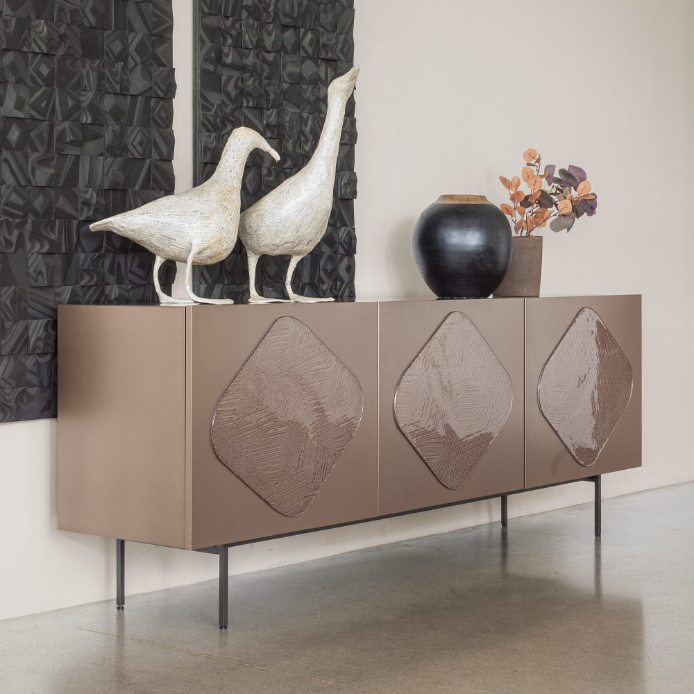 metal feet on which the sideboard rests. These feet elevate the sideboard from the ground, giving a feeling of lightness and airiness to the entire piece of furniture. The effect of lightness is accentuated by the glossy insert that characterises the doors, a detail that adds a touch of refinement and modernity to the design.
