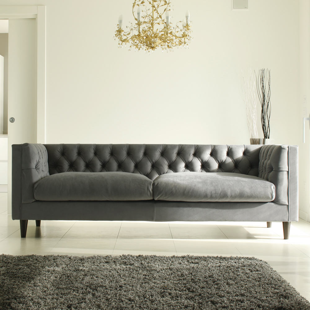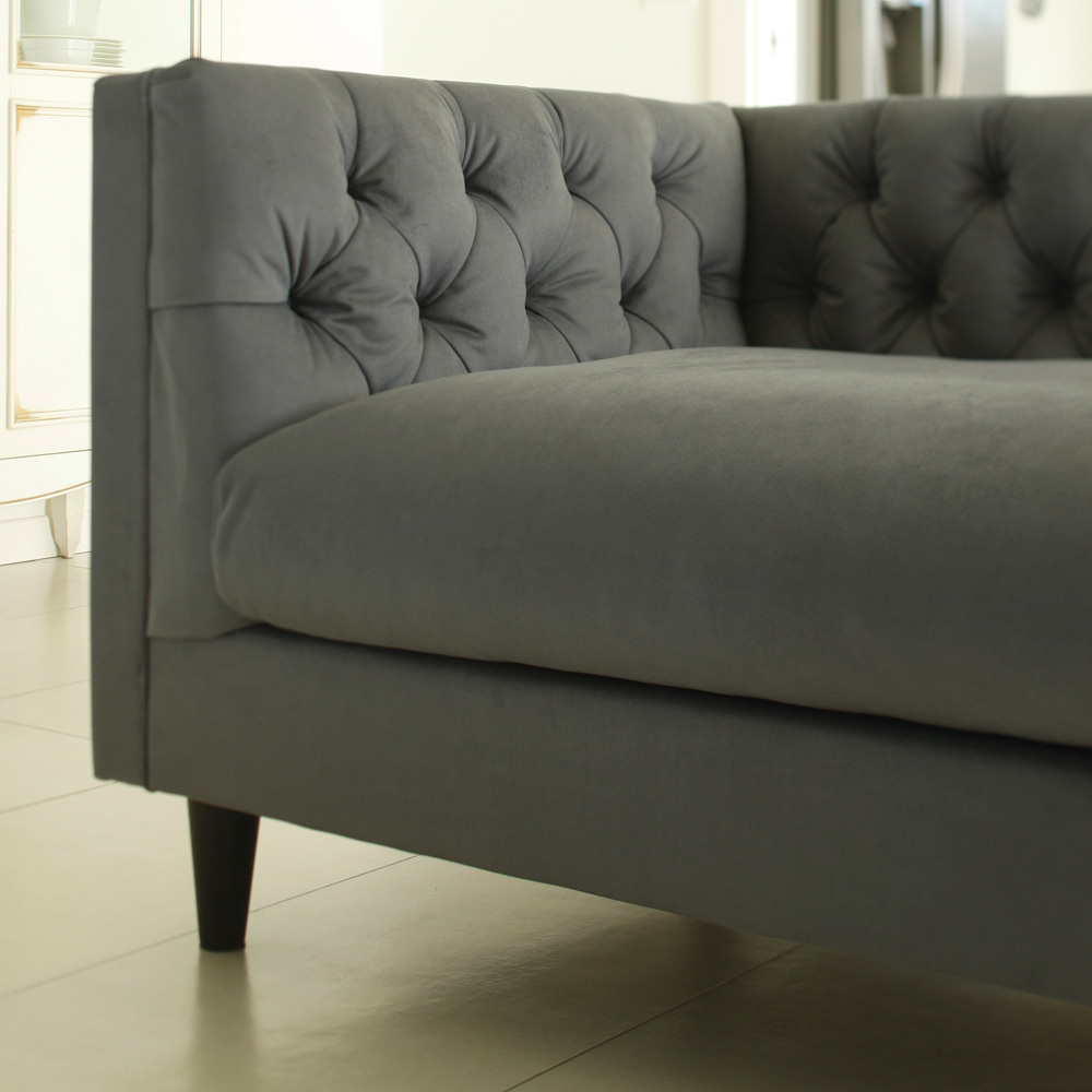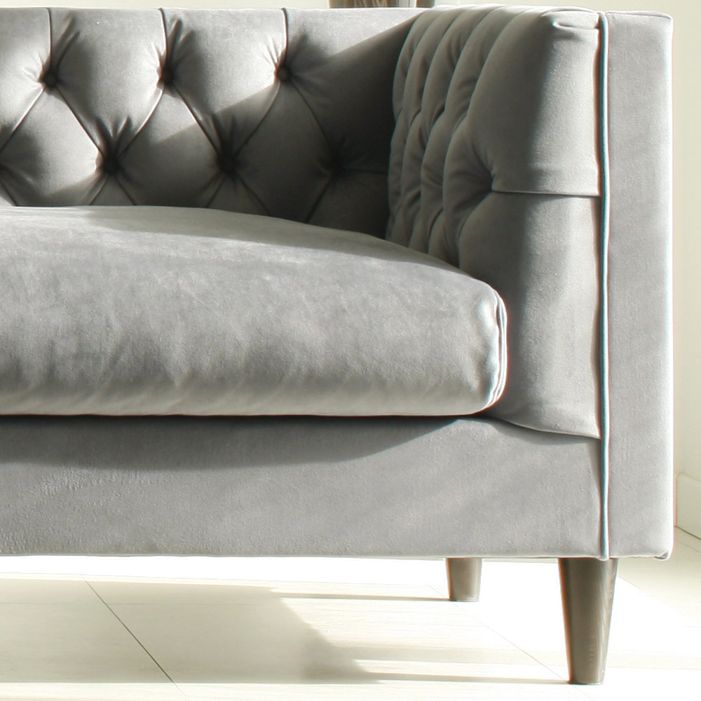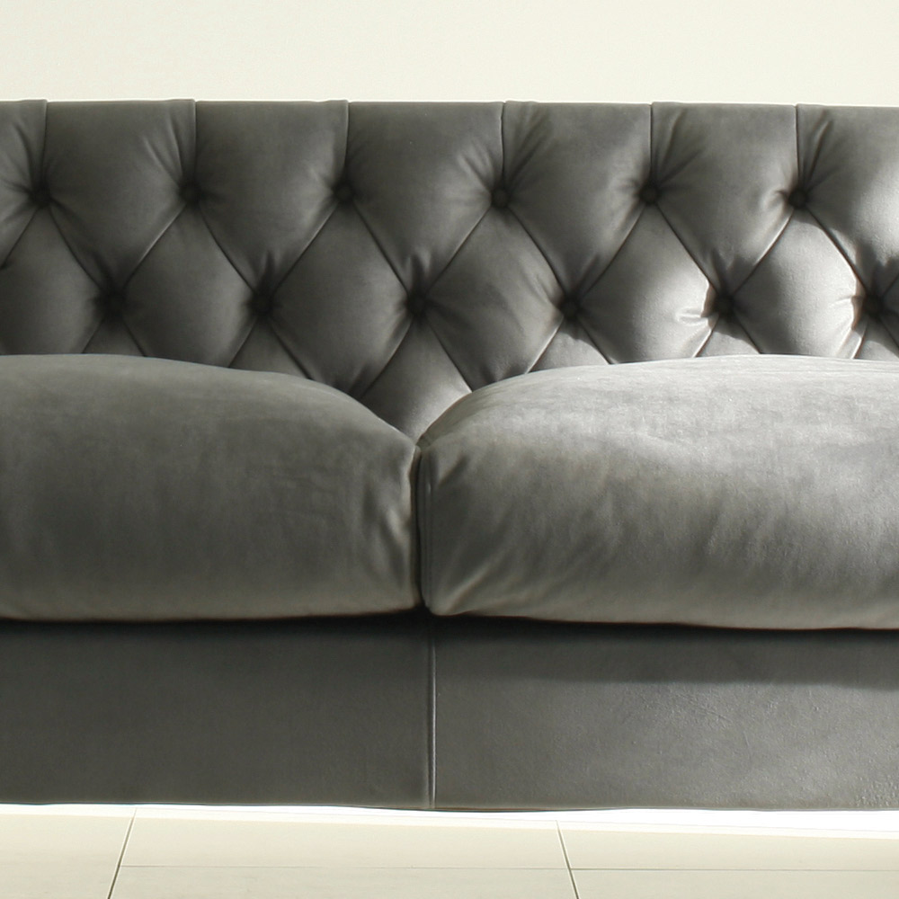 beech wood. The sofa combines classicism with a modern and refined look. Its buttoned tufting and rounded armrests evoke elegance, while the wooden frame and generous padding ensure comfort. The quality upholstery, available in various colours, enriches the look of the sofa. The thin wooden legs add a contemporary touch, making the sofa suitable for both traditional and modern interiors, giving it a cosy and sophisticated atmosphere.