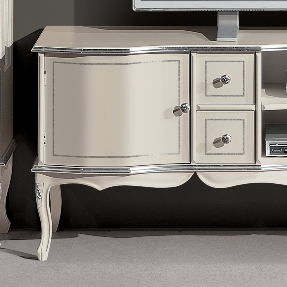 Classic- style lounge TV stand with 2 doors, 4 drawers, and 2 compartments. The style and craftsmanship that characterise the workmanship emerge in this sumptuous piece of furniture crafted from fine white wood with silver details , a refined accessory capable of enhancing the environment in which it is placed. Entirely made in Italy and handcrafted by skilled master craftsmen , it is finished with skill and a taste for elegance. Production is carried out using quality materials , and the workmanship is carried out by hand with the utmost care and professionalism that distinguishes Made in Italy products.