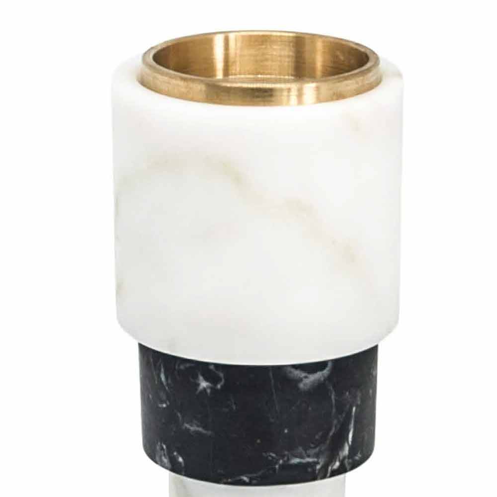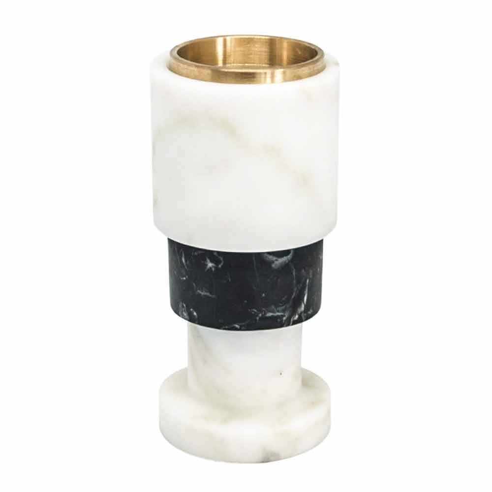 Two- tone candle holder made with high quality marble and brass . It is to be considered a unique piece as each block of marble used differs from the others for veins and shades. The white marble comes from the Poggio Silvestre quarry, a source of first quality marble classified since the last century while the black Marquinia marble is extracted from Spanish quarries.