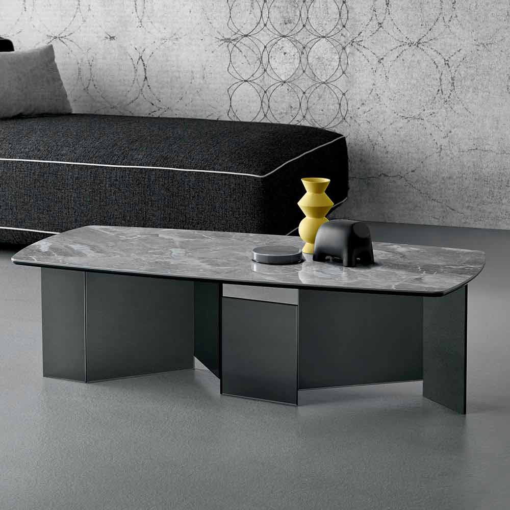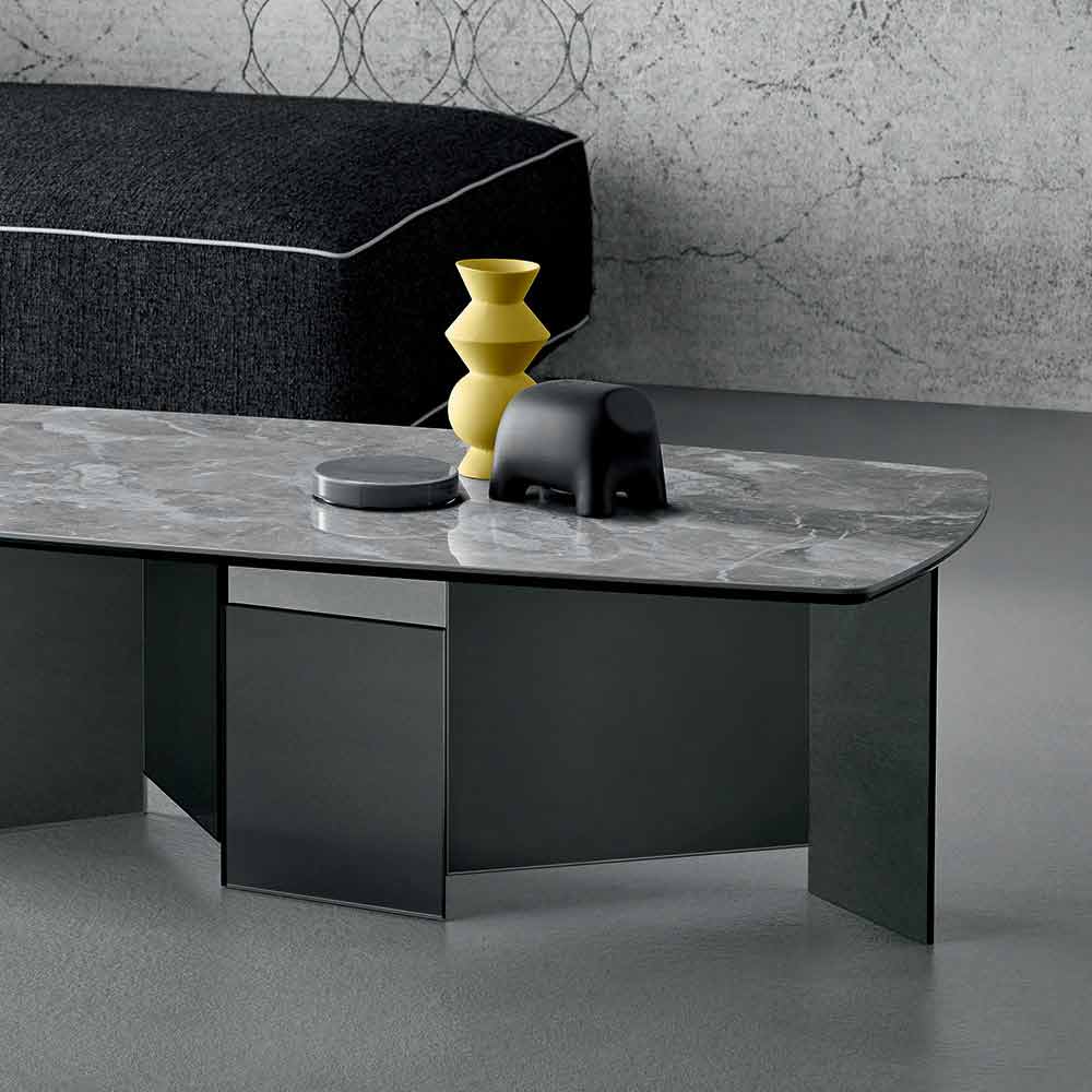 Made of smoked glass for the base and a glossy orobic grey ceramic top , it is a piece of furniture handcrafted in Italy with high quality materials ideal for the living area.