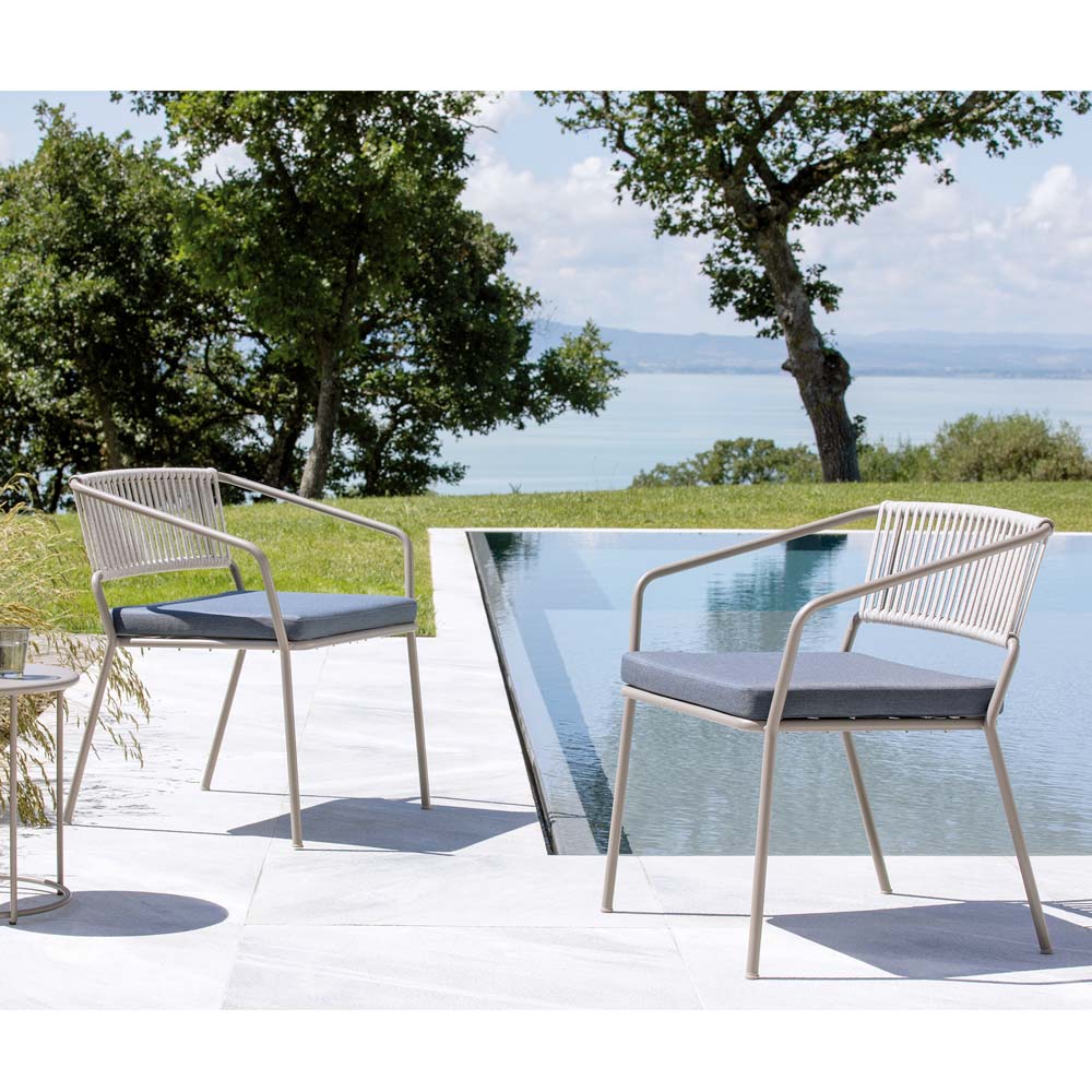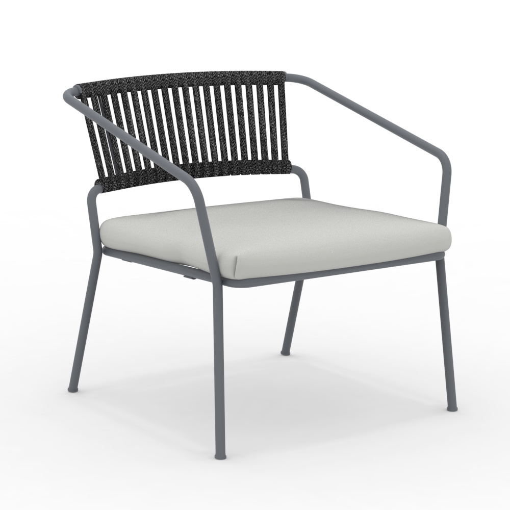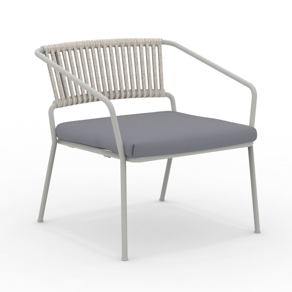 Low garden armchair with powder coated galvanized iron frame and rope and fabric seat Made in Italy