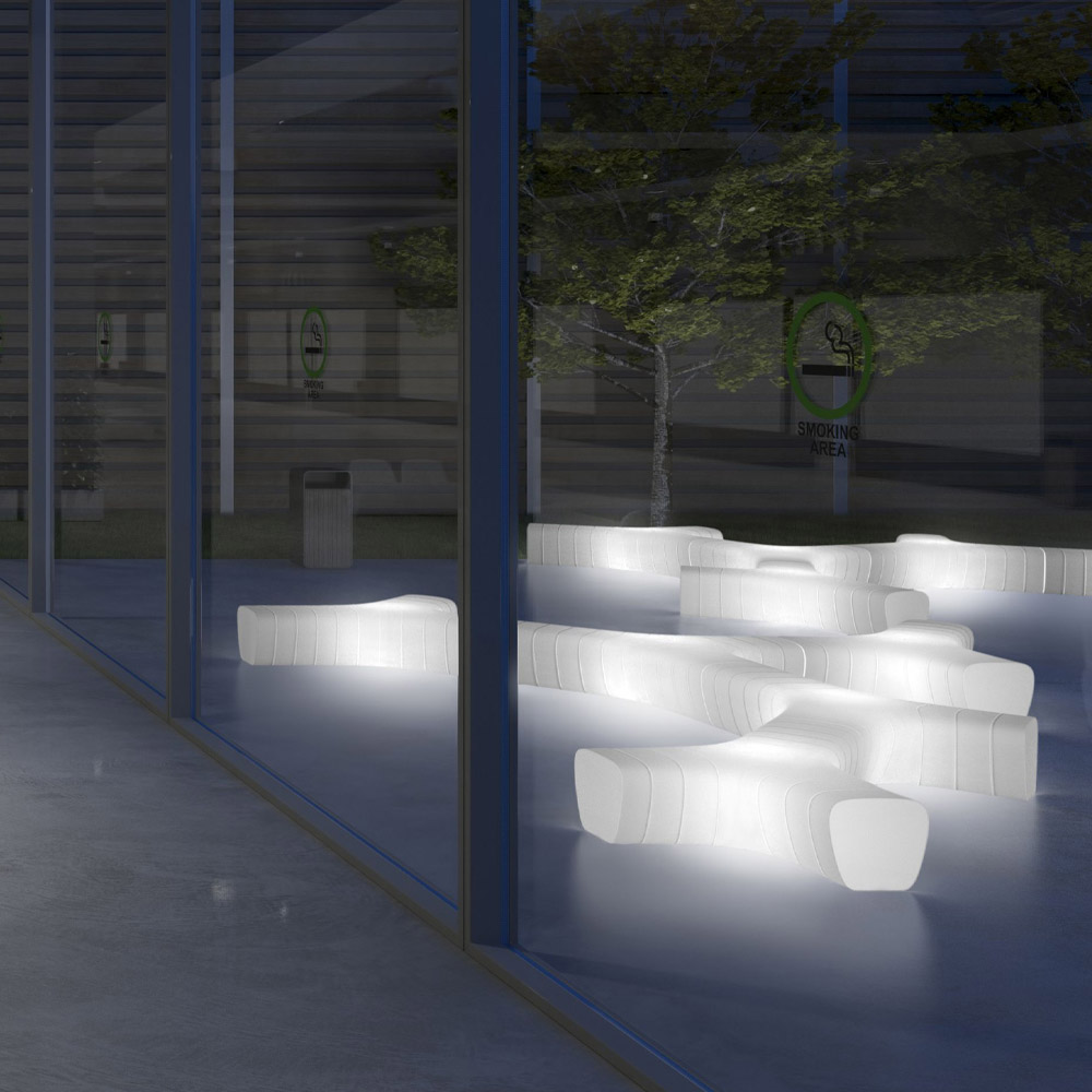 Luminous bench for outdoor use, entirely made in Italy, in opaque polyethylene complete with LED light kit. A piece of furniture designed and conceived to furnish large outdoor spaces. Its shape is ideal for creating articulated and dynamic compositions by combining several elements to create comfortable sofas. The surface is characterized by grooves that create an elegant texturing together with wonderful light and shadow effects thus creating a delicate and welcoming atmosphere. They also give a sense of continuity when several modules are juxtaposed together, thus creating a perfect solution for furnishing large outdoor environments with personality and style. Complete with fixing kit.