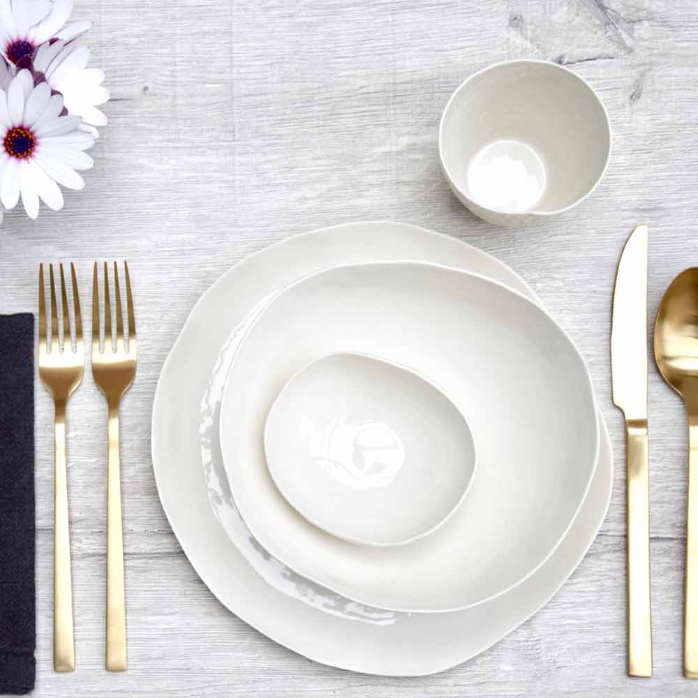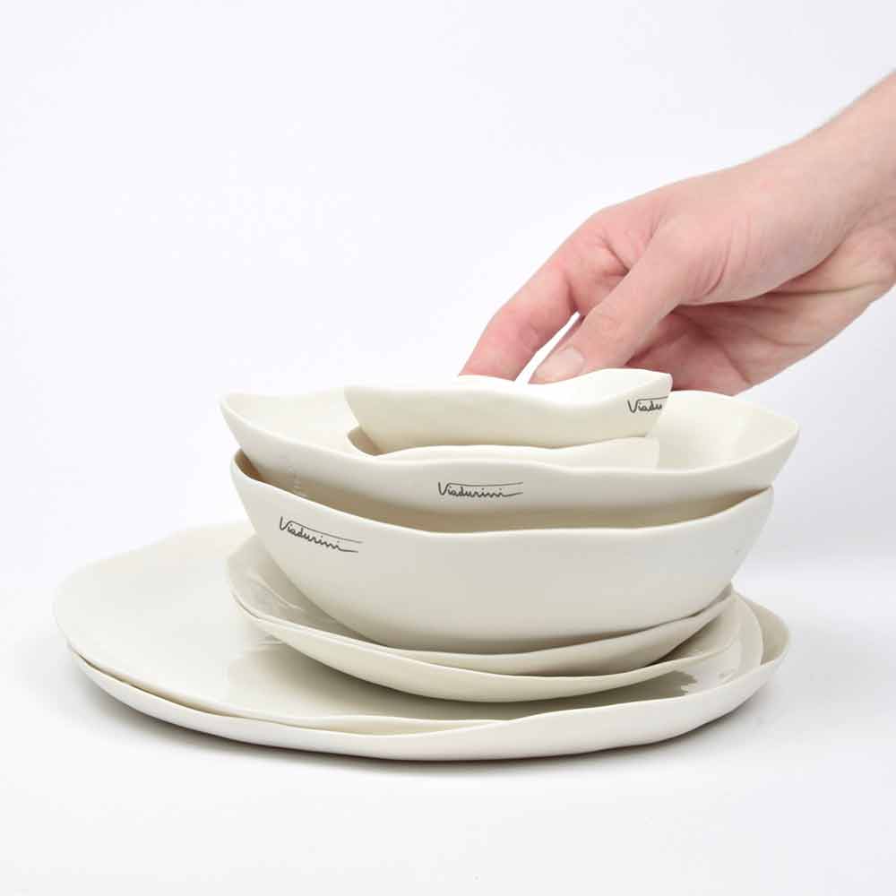 Obtained through the plate technique, which allows to obtain very thin surfaces in order to emphasise the properties of porcelain and its translucency, the dishes are then glazed with transparent crystalline inside and carefully polished outside, evoking sensuality and simplicity of the beauty of porcelain, without sacrificing its practicality.