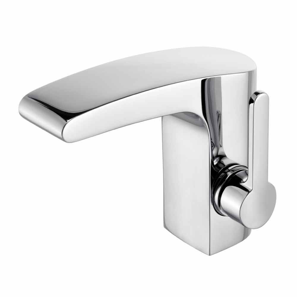 Modern single-lever bathroom sink mixer made of brass with chrome finish .
